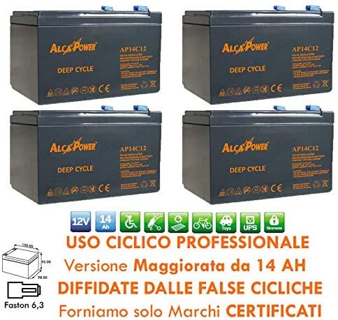 Le batterie ANFEL VLRA (Valve Regulated Lead Acid) sono realizzate con tecnologia AGM (Absorbent Glass Mat), piastre RINFORZATE e materiale elettrolita ad alte prestazioni. Peso 4,100 Kg Per uso intensivo Ciclico su veicoli elettrici come bici elettriche , monopattini elettrici, monta scale elettrici sollevatori carrozzine e tutte le applicazioni con motore elettrico Sono la soluzione ideale per : CARATTERISTICHE GENERALI Batteria sigillata senza manutenzione. Adatta sia in uso ciclico che in uso tampone con terminali faston 6,3 mm. Per uso intensivo Ciclico su veicoli elettrici come bici elettriche, monopattini elettrici, monta scale elettrici sollevatori carrozzine e tutte le applicazioni con motore elettrico Costruita con materiali di alta qualità e affidabilità. Batteria 12 Volt 14 ah Ricaricabile per Uso CICLICO 6DZM per Bici Elettriche monopattini sollevatori carrozzine Scooter Alta RESA RinforzataBATTERIA PIOMBO PROFESSIONALE USO CICLICO 12V 14Ah 150x97x95(h) mm DEEP CYCLE 6-DZM-14 6DZM14 PRODOTTO CICLICO RINFORZATO PER BICI ELETTRICHE E VEICOLI ELETTRICI MONOPATTINI ELETTRICI CARROZZINE ELETTRICHE ELEVATORI ALTA DURATA DIMENSIONE CERTIFICATA 150 x 98 x 95(H)mm SENZA CONNETTORI ALTEZZA CON CONNETTORI 101 MM COME DA NORMATIVA Le batterie CICLICHE ANFEL di questa serie CERTIFICATA sono il frutto di un attento progetto finalizzato a massimizzare le prestazioni ed numero di cicli di carica/scarica. Batterie 12v Ricaricabili Batteria Ricaribaile Per Bici Elettriche Al Piombo 12V Volt 12Ah 6DZM-10 Alta Q | EBay Batteria 12 Volt Ricaricabile DIMENSIONI 151x95x98mm altezza H 95mm Altezza Certificata Ottimo design che permette di installare la batteria in diverse posizioni. Valvola di sicurezza antiesplosione. Dispositivi biomedicali UPS (Uninterruptible Power System) Tensione : 12 Volt SPECIFICHE Tensione nominale: 12V Capacità nominale: 14Ah Lunghezza: 151 mm Profondità: 98 mm Altezza: 95 mm (esclusi i faston) Altezza: 101 mm (inclusi i faston) Connessione: faston 6,3 mm peso 4,1 KG (±5%) Bici Elettrica Scooter Elettrico Monopattini Elettrici Quod Elettrici Monta scala ascensori ed elevatori trazione elettrica Veicoli a motori elettrici Sistemi di allarme Utensili elettrici Sistemi di energia d'emergenza Sistemi di sicurezza.