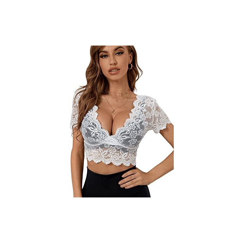 SheIn Crop Top Da Donna In Pizzo Trasparente Con Scollo A V, Bianco, S