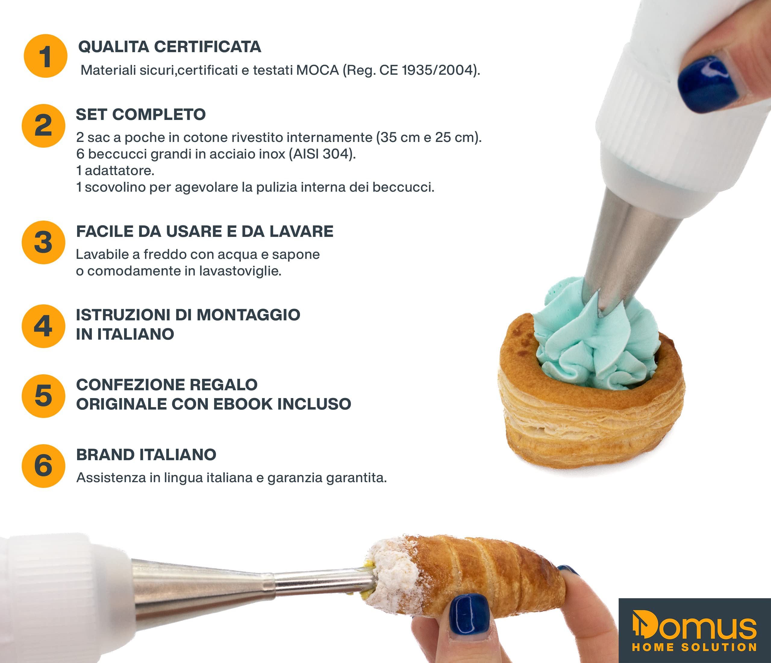 Progettato per offrire prestazioni elevate, durata nel tempo e facilità d’uso, questo kit ti accompagnerà in ogni creazione dolciaria, dalla più semplice alla più elaborata. Sac A Poche 22 Pezzi Cotone, Professionali Di Cotone Riutilizzabile, Kit Sacca A Poshe Per Dolci Pasticceria, Con Sac à 3 Poche E 10 Beccucci, Per Bigné Di Cottura (22 Sacco A Poche Confezionato Tutti i materiali sono certificati per l’uso alimentare e testati secondo le normative UE, per garantire sicurezza e qualità. Questo set non solo è funzionale, ma anche un’ottima idea regalo per ogni occasione speciale: compleanni, Natale, Pasqua o semplicemente come sorpresa per chi ama sperimentare in cucina. Confronta 26 offerte per Sac A Poche In Cotone Con Beccucci a partire da 5,99 € · Prodotti rilevanti · Marca · Ultimi articoli in Tavola e Cucina 【Lavabile in lavastoviglie e facile da pulire】: Tutti i componenti del set sono lavabili in lavastoviglie. 【Cotone di alta qualità e rivestimento interno】: Le sacche sono realizzate in cotone spesso e durevole, con rivestimento interno antiaderente che garantisce una facile estrusione e una presa salda, senza rischio di rottura o perdita di impasto Se ami preparare dolci fatti in casa o desideri fare un regalo utile e creativo a un appassionato di pasticceria, questo set di sac à poche professionale in cotone è la scelta perfetta. Inclusa una spazzolina per la pulizia dei beccucci Ottimo anche per riempire bignè, zeppole, churros e altri dolci La dotazione include anche sei beccucci decorativi in acciaio inox senza saldature, che consentono di creare numerosi motivi decorativi: stelle, fiori, foglie, linee, bordi e forme personalizzate. Il set comprende tre sacche da pasticcere riutilizzabili di lunghezze differenti (30 cm, 35 cm e 40 cm), realizzate in cotone resistente agli strappi con rivestimento interno impermeabile, per una presa comoda e sicura. Il pratico adattatore incluso permette di sostituire le punte rapidamente, senza svuotare la sacca. Per una pulizia completa, troverai anche una spazzolina per i beccucci. Ideale per creare dolci perfetti con crema, panna, cioccolato o glassa colorata 【Regalo perfetto per pasticceri amatori e professionisti】: Questo kit sac a poche riutilizzabile è perfetto per compleanni, Natale o Pasqua. Un’idea utile e creativa per chi ama cucinare