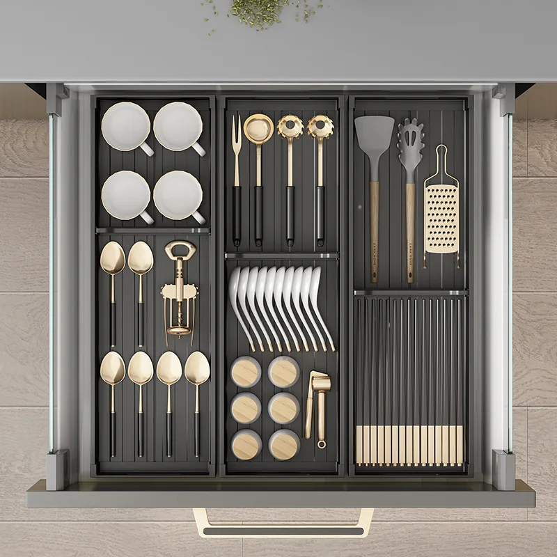 Divisori Per Cassetti MDesign Porta Posate Con 4 Scomparti – Organizer Per Posate E Altri Utensili, Estraibile – Portaposate Per Cassetti In Plastica, Ideale Per Diversi Utensili Da Cucina – Grigio Scuro Porta Cialde Caffe