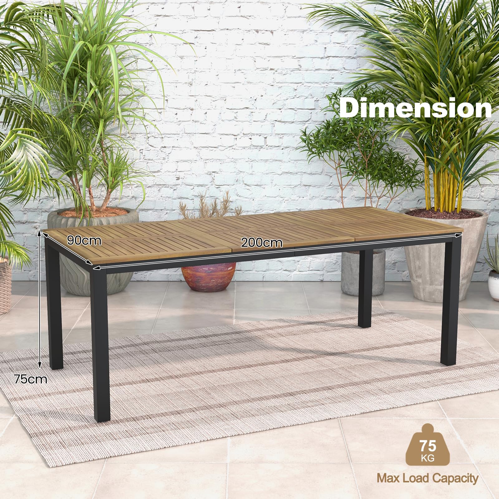 Inoltre, le gambe regolabili in altezza assicurano che il tavolo rimanga stabile anche su superfici irregolari. Peso netto: 23 kg (modello B) /26 kg (modello A) Contenuto della confezione: 1 tavolo da pranzo. 1 manuale di istruzioni. Dimensioni complessive: 200 × 90 × 75 cm (L × W × H) Portata: 75 kg. Adatto per uso interno ed esterno. Materiale: legno di acacia, metallo. Tavolo da pranzo con foro per ombrellone: il tavolo da pranzo ha un foro rotondo al centro di 5 cm in cui è possibile posizionare un ombrellone per proteggersi dal sole e dare ombra alle vostre attività all'aperto Posti a sedere fino a 8 persone Gambe regolabili in altezza. Benvenuti da Comforteu: Puoi usare questo tavolo da pranzo per goderti un pasto con la tua famiglia a casa o per incontrarti con gli amici sul prato durante il fine settimana. Versatile: questo tavolo da pranzo può essere utilizzato non solo in sala da pranzo o in soggiorno, ma anche in giardino, sul prato o nel parco. Tavolo da pranzo con foro per ombrellone: il tavolo da pranzo ha un foro rotondo al centro di 5 cm in cui è possibile posizionare un ombrellone per proteggersi dal sole e dare ombra alle vostre attività all'aperto. Gambe in metallo per una maggiore stabilità. Il foro centrale preforato consente di inserire un ombrellone per proteggerlo dal sole caldo all'aperto. Tavolo Da Giardino In Legno Set Da Pranzo Da Giardino 6 Posti JAVA Con Ombrellone (12 Opzioni) Legno D' Acacia Marrone Chiaro Tavolo Da Giardino Con Foro Il piano extra grande offre spazio sufficiente per cibo e bevande. Stabilità strutturale: il tavolo da terrazza è supportato da robuste gambe in metallo, molto stabili. Materiali selezionati: questo tavolo da giardino è realizzato in 3 pezzi di legno di acacia di colore naturale, impermeabile e durevole.
