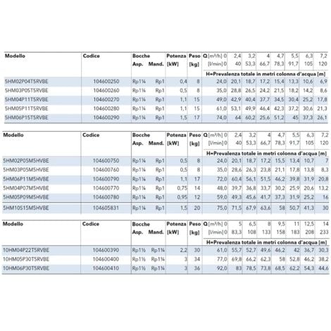 Caratteristiche ; Pressione. 10 bar ; Materiale. Acciaio inossidabile ; Colore. Grigio ; Forma. Ovale ; Altezza di mandata max. 45.5 m ELETTROPOMPA POMPA 3HM05P07M LOWARA 3HM05 + Presscontrol GENYO 8A/F22 2,2 BAR
