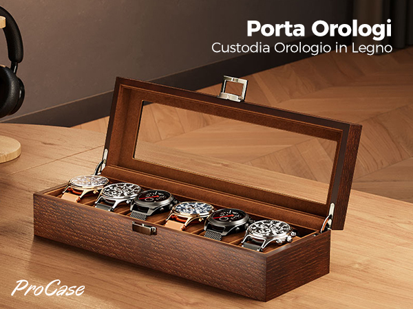 ProCase Porta Orologi Uomo In Legno A 6 Posti, Scatola Porta Orologi Con Coperchio In Vetro, Custodia Orologio Portagioie Uomo Regali Per La Festa Del Papà/Regali Per Lui -Espresso