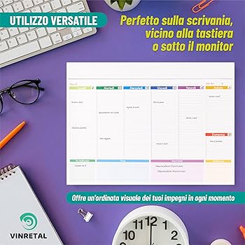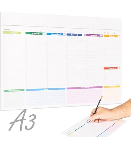 Realizzato e stampato interamente in Italia, questo prodotto unisce stile e praticità, con un design pulito e un formato compatto che si adatta a ogni ambiente. Questo planner è composto da 52 fogli, uno per ogni settimana dell'anno, stampati su carta usomano di alta qualità, perfetta per scrivere in modo fluido senza sbavature. Blocco da tavolo settimanale - data libera - 38,5x29,5 cm - domenica intera - collato ... Poter contare su un planning settimanale da tavolo consente di organizzare al meglio il proprio lavoro e non perdere alcun appuntamento senza segnarlo. La divisione Planner Settimanale Pubblimania MINI PLANNING SETTIMANALE Da Tavolo Per Scrivania Cm 29 Planning Settimanale Da Tavolo 2025 Organizza la tua settimana con facilità: Con un formato A4 pratico e spazioso, questo planning settimanale ti permette di visualizzare tutti i tuoi impegni in un colpo d'occhio, perfetto per chi ama pianificare con precisione! Elegante e funzionale per ogni ambiente: Il design semplice ed essenziale si adatta perfettamente a qualsiasi stile di arredamento, rendendolo un accessorio indispensabile per organizzare i tuoi spazi con stile. La sua eleganza e funzionalità lo rendono adatto a qualsiasi scrivania, sia a casa che in ufficio. Alta qualità Made in Italy: Stampato in Italia su carta usomano di qualità superiore, garantisce resistenza e un tocco elegante, perfetto per uffici, studi e scrivanie professionali. Organizza le tue giornate con il planning settimanale da tavolo in formato A4, progettato per offrirti un’intera settimana di impegni a portata di mano.
