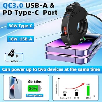 Ricarica Rapida PD : Presa usb moto impermeabile ha 18W USB-A ( QC3.0 ) + 30W USB-C (porta PD ) con ricarica rapida a due porte, può caricare da 0% a 80% in 35 minuti a velocità 4x (SUGGERIMENTO: non applicabile se il telefono stesso o il caricabatteri Funziona alla grande su auto, moto, auto da spiaggia, SUV e navi. Dallo 0% all'80% a una velocità quattro volte superiore in 35 minuti. Caricabatterie rapido doppio A+C per moto: il caricabatterie per auto moto è dotato di una porta di ricarica rapida USB (18 W) + PD (30 W). Impermeabile IP66: presa USB C QC 3.0 dotata di un cappuccio protettivo completamente sigillato che è impermeabile al 100% e antipolvere. Carica Batteria Per Auto Cellulare 12v Usb Charger, PD 20W USB-C Power Socket And 18W QC3.0 Socket Waterproof Power Outlet 12V/24V With Power Switch 12V USB C Outlet For Car Golf Cart Boat Marine Bus Truck Presa Usb Auto Due metodi di cablaggio: il terminale ad anello impermeabile all'estremità della linea è collegato direttamente ai poli positivo e negativo dell'alimentatore, oppure il terminale ad anello è collegato al terminale a forma di U esteso per collegare i poli positivo e negativo dell'alimentatore.