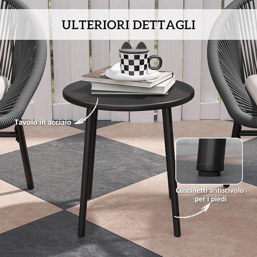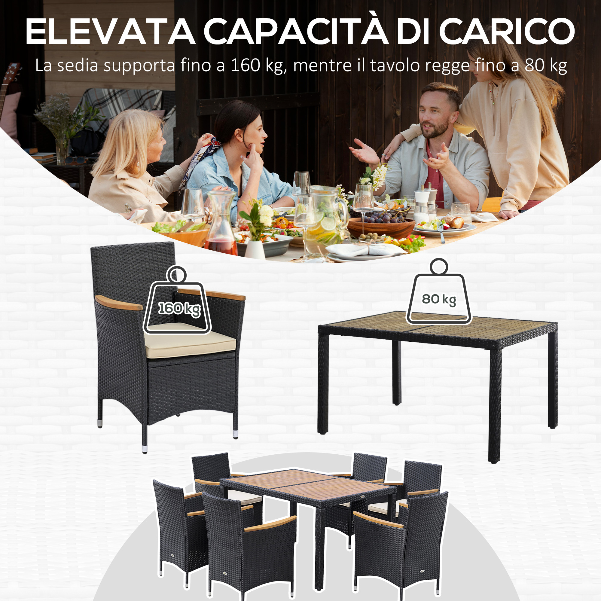 Aosom Outsunny Set Poltrone Da Giardino SET DA GIARDINO 4 PEZZI IN RATTAN CON TAVOLINO DA CAFFÈ. 2 DIVANI AD ANGOLO E POLTRONCINA. NERO GRIGIO E BLU Salottino Da Giardino Esterno Set Tavolo E Sedie Da Giardino 7 PEZZI: Dotato di 6 sedie da pranzo e di un tavolo da giardino, il set da giardino formato da 7 pezzi riunisce la famiglia e gli amici per tanti simpatici ritrovi in compagnia, costituendo un elemento centrale per feste e altri eventi nei tuoi spazi all'aperto Descrizione:Stai cercando dei mobili da giardino per il tuo cortile? Prova questo set Outsunny in rattan da 7 pezzi . Il rattan di vimini PE intrecciato interamente a mano si abbina ai cuscini imbottiti. Costruito per stile e resilienza, la struttura in a Questi presentano una copertura rimovibile per pulire facilmente questa superficie nera Dimensioni sedia: 58L x 62P x 87Acm. Capacità di peso: 120 kg (sedia), 70 kg (tavolo). Montaggio richiesto DIMENSIONI: Dimensioni tavolo: 150L x 90P x 72A cm. DESIGN STABILE: I cuscinetti antiscivolo del salotto da giardino assicurano la stabilità e prevengono i movimenti indesiderati, consentendo di passare il tempo e rilassarsi in modo confortevole e sicuro