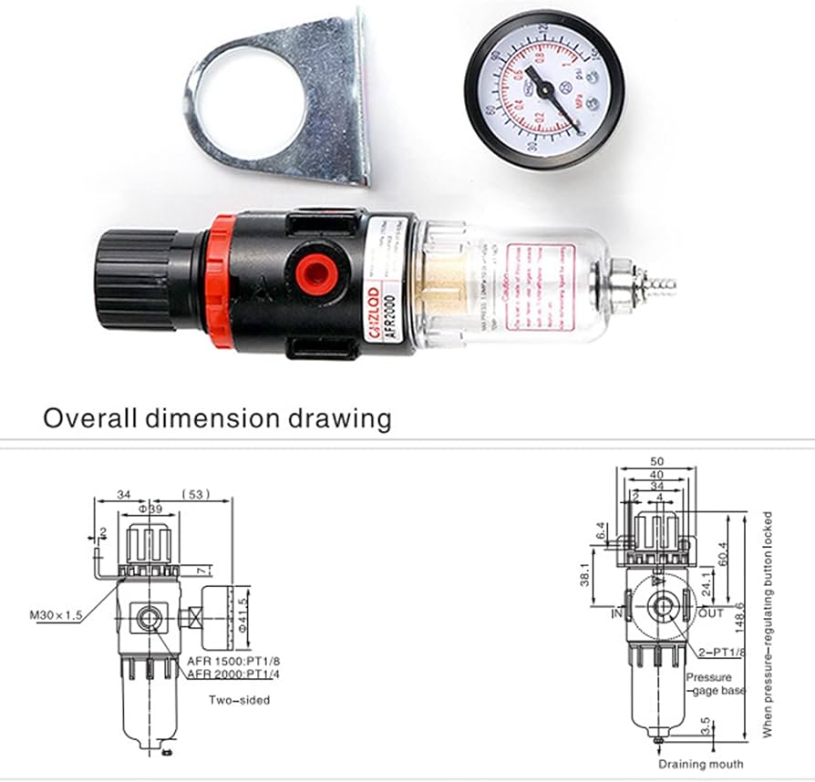 Filtro Aria Compressore REGOLATORE DI PRESSIONE SEPARATORE DELL' ACQUA PER COMPRESSORE E Manometro Pressione Acqua ALTA PRECISIONE DI FILTRAGGIO: il filtro del regolatore di pressione dell'aria adotta una coppa del filtro trasparente, il corpo della coppa è ingrandito e ispessito, ha un'elevata precisione di filtraggio e prestazioni stabili. FACILE DA INSTALLARE: il set separatore acqua olio aria compressa include manometro, staffa e tubi di collegamento, facile da installare e utilizzare. pressione compressore regolatore separatore 51mm filtro aerografi GAMMA DI LAVORO: il diametro della porta del regolatore del filtro dell'aria compressa è di 1/4 di pollice, la pressione massima regolabile è di 1,0 MPa, con struttura semplice e funzionamento conveniente.