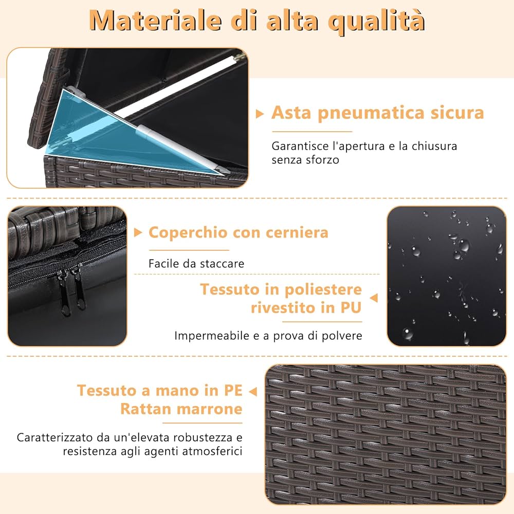 Il baule plastica ha una grande capacità di 662 litri ed è adatta per riporre cuscini, coperte, giocattoli, attrezzi e altri oggetti. È perfetto per feste all'aperto e per rilassarsi con la famiglia Sul fondo della cassapanca da esterno ci sono 2 ruote universali con braccioli laterali, rendendola facile da spostare. Cassapanca molto ampia # Con 146 x 72 x 63 cm di spazio interno, la cassapanca in rattan ha una capacità di 662 L per contenere vari oggetti, come cuscini, coperte, giocattoli, attrezzi, snack. Quando il coperchio è chiuso, può diventare un perfetto tav È versatile e può essere utilizzata sia come baule da esterno che come tavolino da salotto all'aperto, rendendo la tua vita infinitamente più comoda. Descrizione del prodotto: La panca contenitore esterno in rattan è realizzata in rattan PE, che non solo ha un aspetto elegante, ma è anche pratico e resistente. Contenitore Da Esterno Outsunny Cassapanca Da Esterno In Rattan Design 2 In 1, Baule Da Esterno Con Seduta In Legno, 121x50x50cm, Grigio | Aosom Italy Baule Da Esterno Impermeabile FUNZIONALITÀ MULTI-USO: Questo baule da giardino in pe rattan può anche essere utilizzato come tavolino da salotto sulla terrazza quando il coperchio è chiuso, donando al tuo tempo libero un tocco di eleganza e comfort. Vantaggi: Intrecciato in rattan PE, elegante e resistente Capacità di 662 litri per la conservazione senza problemi Dotato di ruote universali e maniglie per un trasporto facile Rivestimento impermeabile e anti-polvere per proteggere gli oggetti dall'asciugatura Telaio in metallo e piedi centrali per stabilità e durata Versatile, può essere utilizzato come cassetta portaoggetti o tavolino Può essere utilizzato per un comfort aggiuntivo sia all'aperto che al chiuso Specifiche tecniche: Colore: Marrone Materiale: PE-Rattan, Metallo, Poliestere, PU Capacità: 662 L Dimensioni totali: 150 x 77 x 73 cm (L x P x A) Dimensioni interne: 146 x 72 x 63 cm (L x P x A) Portata su un lato superiore: 45 kg Portata su un lato interno: 30 kg Peso netto: 20 kg Parti: 1 x Baule da esterno in rattan PE con rivestimento in PU 1 x Istruzioni Inoltre, il robusto telaio in metallo e le gambe centrali garantiscono stabilità. Anche se rimane per lungo tempo all'aperto, mantiene il suo colore e la sua lucentezza freschi e nuovi per lungo tempo FACILE DA SPOSTARE: Le 2 ruote universali appositamente attrezzate con braccioli laterali integrati rendono incredibilmente facile da spostare questa cassapanca da esterno in pe rattan.