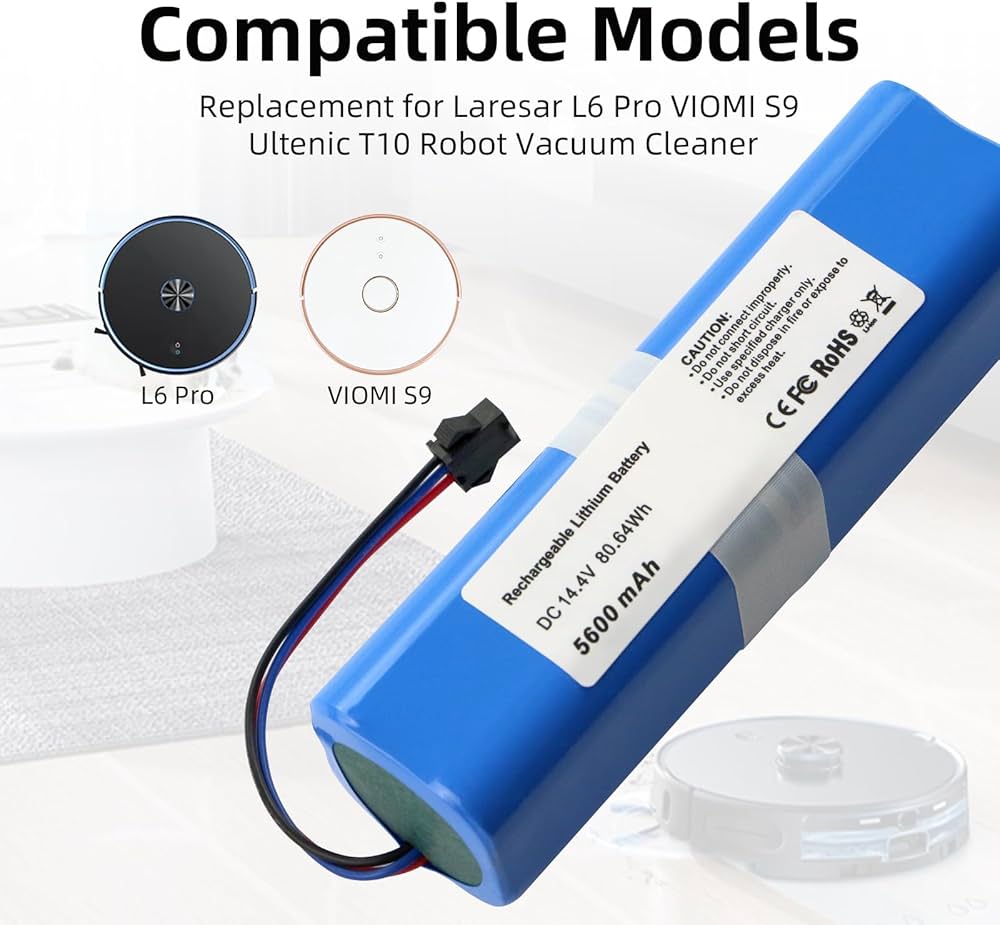 【Specifiche】Tipo di batteria: Li-ion; Tensione:14.4V; Capacità:5600mAh; Durata della batteria: Tempi di ciclo: ≥500 cicli; Tempo di esecuzione: ≥60 minuti per carica. Ultenic T10 Robot Vacuum Cleaner K KYUER 5600mAh T-4S2P-A Replacement Batteria per Ultenic T10 Laresar L6 Pro Viomi S9 Robot Vacuum Cleaners Battery with Tools 14.4V Vacum Cleaner Palogreen Replacement Battery For Laresar L6 Pro, Ultenic Ultenic T10 Pro 【Numero di parte compatibile】Compatibile con T-4S2P-A Battery. 【Perfetto post-vendita】Benvenuti a contattarci via email se avete problemi, domande o preoccupazioni, promettiamo di risolvere il problema entro 24 ore,siamo così sicuri delle prestazioni delle nostre batterie per portatili di ricambio, che uniamo una garanzia di 18 mesi con ogni singolo acquisto. Spegnere il pulsante di alimentazione dell'aspirapolvere e spostarlo manualmente sul caricatore per riattivare la batteria, quindi riaccendere il pulsante di alimentazione. 2. La batteria funziona solo per pochi minuti Pulire il filtro e rimuovere i capelli aggrovigliati nella spazzola per prolungare il tempo di funzionamento. 【Test approfonditi e completi】Questa serie di robot aspirapolvere è stata testata per garantire una capacità ottimale e per assicurare il rispetto di tutti i requisiti di sicurezza, il tutto prima dell'installazione. Compatibile con la batteria originale: T-4S2P-A