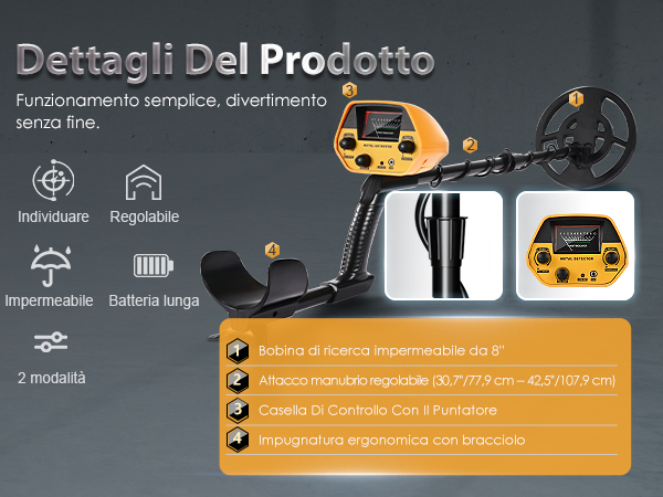Può passare la certificazione FCC e ROHS. È possibile regolare la lunghezza del rivelatore per usarlo facilmente (Max: 108 cm/42,5 pollici; Minimo: 78 cm/30,7). La macchina è portatile. L'asta regolabile e la bobina di ricerca sono impermeabili, perfette per l'esplorazione di spiagge, giardini, foreste, prati o montagne e anche per il tuo hobby di esplorazione subacquea per tesori come fiumi o oceani 【Display a LED】Modalità di visualizzazione del puntatore, il valore è da 0 a 10, che corrisponde alla forza del segnale di rilevamento del metallo di destinazione. L'albero regolabile e la bobina di ricerca sono impermeabili, molto adatti a tutti i tipi di situazioni, ad esempio sulla spiaggia, in giardino, nella foresta, nei prati o durante l'esplorazione in montagna, l'esplorazione subacquea di tesori come il fiume o in riva al mare. Semplice e facile da usare, si adatta molto bene a bambini e adulti. 【Buona scelta per gli sport all'aria aperta】Il metal detector ha un jack per cuffie universale da 3,5 mm, è possibile collegare altri auricolari (non inclusi) al metal detector e regolare il volume per adattarsi a diversi ambienti. 1 Tutto Metallo 2 Modalità DISCO 3 Puntatore 4 Bobina Impermeabile 【Bobina di ricerca impermeabile da 7,5 pollici】La grande bobina di ricerca da 7,5 pollici può raggiungere esattamente la profondità di 6 pollici sotto terra e il rilevamento della bobina è sensibile. La modalità di rimozione può proteggere alcuni metalli di basso valore che non vengono rilevati e distinguere i metalli di grandi dimensioni che vogliono essere rilevati. Oro Trsaow - Rilevatore In Oro Leggero Con Bobina Impermeabile Da 20 Cm, Ad Alta Sensibilità, Longtiud Regolabile Per Bambini Adulti Principianti, 2 Modalità : Amazon.it: Giardino E Giardinaggio Metal Detector