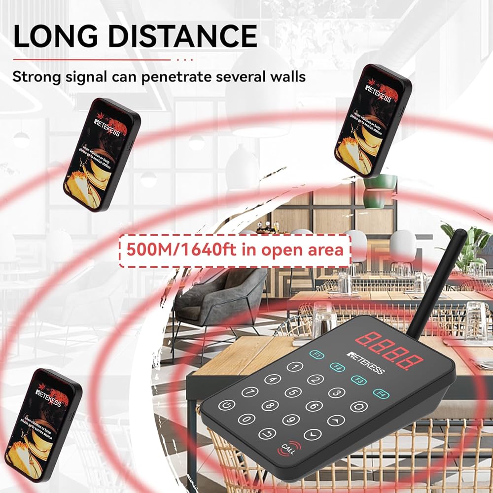 Gli intervalli numerici possono essere impostati da 1 a 999 Un supporto 20 -una tastiera può controllare due cabine contemporaneamente Retekess TD177 Cercapersone Ristorante Wireless, 30 Cercapersone , 500M, Accoppiamento Con un Clic, Allarmi Fuori Gamma, IP67 Impermeabile, Cicalino Cercapersone per Food court, Parco Giochi, Club Facile da espandere; chiama persone ristorante; più slot di ricarica possono essere assemblati liberamente; estensione espandibile con un supporto 20/30 Se il cliente non ritorna dopo un certo tempo; il cercapersone continuerà a emettere segnali acustici finché non verrà riposto sulla base Impostare in anticipo la lunghezza dell'intervallo numerico del numero del cercapersone; basta fare clic su F2 per modificare rapidamente il numero ID del cercapersone e l'ordinamento automatico. Un supporto 30 - 30 cercapersone tutti posizionati in una cabina; ti consente di affrontare facilmente periodi di passeggeri di grandi dimensioni Un arresto chiave; premere il pulsante di accensione sulla tastiera; cicalino cercapersone verrà acceso/spento; allo stesso tempo anche il corrispondente host trasmittente entra nello stato corrispondente 500M di lunga distanza; pager ristorante TD177 è dotato di antenna esterna integrata; la distanza di lavoro è di circa 300-500 metri all'aperto; consenti ai tuoi clienti di aspettare nelle loro auto Dopo aver ricevuto il promemoria; gli ospiti possono disattivare l'audio del cercapersone 1 Allarme anti-smarrimento 2 Lunga distanza 3 Batteria da 300 mAh Cercapersone Ristorante Offerte Retekess Td177 Wireless Vacanze In Restaurant Pager System Chiamata di gruppo senza riassociazione; basta premere F3 per chiamare contemporaneamente i due cercapersone; fare nuovamente clic su F3 per annullare la chiamata di tutti i cercapersone Associazione automatica; impostare in anticipo la lunghezza dell'intervallo numerico del numero del cercapersone; fare clic su F2; la base del sistema di chiamata wireless TD177 inizierà a scrivere il numero del cercapersone in sequenza; ad esempio (1; 2; 3; 4... oppure 2; 4; 6; 8...) Sistema cercapersone del ristorante per avviare il conto alla rovescia dopo essere stato rimosso dalla base di ricarica e quando il conto alla rovescia viene reimpostato su 000; il cercapersone chiederà automaticamente ai clienti di ritirare i pasti Associazione automatica; promemoria per il conto alla rovescia del timer; chiamate di gruppo con un solo clic Design intelligente; soluzione di cercapersone più semplice e veloce 7 Modalità di chiamata; vibrazione/bip/luce possono essere combinati liberamente; è possibile scegliere la modalità di promemoria dei cercapersone e dei segnali acustici TD177 in base all'ambiente. 30 cercapersone di grande capacità; TD177 sistema cercapersone per ristoranti segnalazione telefonica gestire facilmente i periodi di grande affluenza, aiutandovi a migliorare l'efficienza del servizio Programmazione di un tasto