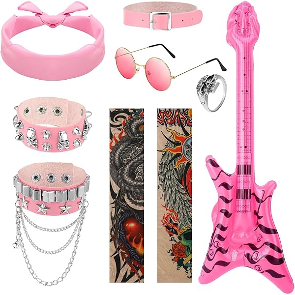 Dreamtop Set Di 10 Pezzi Per Costume Punk Rockstar Gotico Rocker Set Rock Star Accessori In Metallo Pesante Con Guanti Occhiali Da Sole Bandana Tatuaggio Maniche Bracciale Anello Microfono Gonfiabile