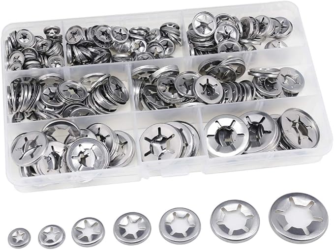 È facile da installare, durevole e non si deforma. Facile da installare: basta posizionare il disco interno o il disco stellare sulla vite o sul bullone e serrare di nuovo. FOMGIIN 40 rondelle Starlock M6 , dentata interna, rondella in acciaio inox , anelli di sicurezza in argento, rondelle Starlock Contenuto della confezione: 10 rondelle Starlock in acciaio inox 304 M6 x 16. Materiali di alta qualità: l'anello di sicurezza interno è realizzato in acciaio inossidabile 304 A2 di alta qualità con bordi lisci, resistente alla corrosione, senza sbavature, resistenza alle alte e basse temperature, non arrugginisce facilmente e può essere utilizzato all'aperto e in ambienti umidi. Materiale: acciaio inox 304 A2. Dimensioni: M3 / M4 / M5 / M6 / M8 / M10 / M12. Quantità: 10 pezzi/40 pezzi. Ampia applicazione: i dischi di sicurezza a stella sono ampiamente utilizzati per smorzare le vibrazioni e il fissaggio in mobili, automobili, tosaerba, camper, dispositivi elettronici, attrezzature sportive, barche, magazzini e produzione industriale. Il design dentato o a forma di stella blocca l'elemento di fissaggio e impedisce che si stacchi con il tempo. L'anello di sicurezza interno per ingranaggi è realizzato in acciaio inossidabile 304 A2 di alta qualità con bordi lisci, resistenza alla corrosione, senza sbavature, resistenza alle alte e basse temperature, non facile da arrugginire e può essere utilizzato all'aperto e in ambienti umidi. Il design dentato o a forma di stella blocca il dispositivo di fissaggio e impedisce che si stacchi nel tempo. Basta posizionare il disco interno o il disco a stella sulla vite o sul bullone e serrare di nuovo. Rondelle Antivibrazione Inox Spingere I Dadi E Le Rondelle Starlock Di Bloccaggio Della Velocità Ring Sicurezza