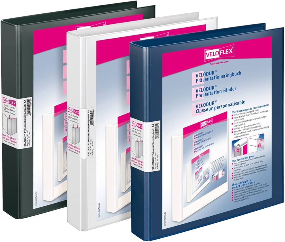 Veloflex - Quaderno ad anelli Velodur, con 2 anelli, formato A4, 40 mm, bianco Raccoglitore ad anelli di presentazione Veloflex. Materiale: polipropilene (PP). Colore del prodotto: Bianco. Dimensioni: A4. Larghezza: 280 mm. Profondità: 60 mm Altezza: 315 Altezza di riempimento 50 mm Tasca posteriore allargata Meccanismo ad anello 2-D Quaderno Ad Anelli Veloflex 5158000 Rubrica Telefonica Ad Anelli, Formato A5, Colore: Giallo Quaderno Ad Anelli A4 La tasca del dorso è più ampia e facilita l'inserimento dell'etichetta del dorso. Formato DIN A4 Laminato in PP Il raccoglitore ad anelli di presentazione VELODUR di Veloflex ha un formato DIN A4. La cartella ha un formato di 295x315x70 mm.