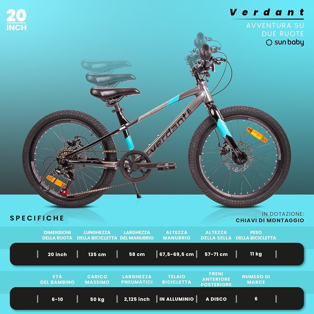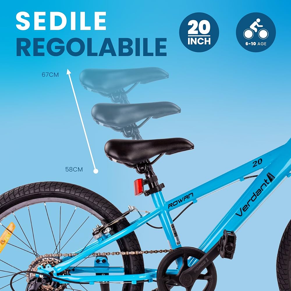 Freno a V anteriore/posteriore Cavalletto laterale Catarifrangenti sui raggi È dotata di ruote da 20 pollici con cerchi in alluminio, che garantiscono leggerezza e resistenza. ALTA QUALITÀ DI COSTRUZIONE 🛠️ La bicicletta Verdant è una scelta eccellente per i ragazzi dai 6 ai 10 anni. È dotata di ruote da 20 pollici con cerchi in alluminio, che garantiscono leggerezza e resistenza 🟢 SUPPORTO ALLO SVILUPPO MOTORIO E FISICO 🚴♂️ La bici Verdant è uno strumento perfetto per supportare lo sviluppo motorio e la forma fisica dei bambini. Piedino laterale Il robusto piede laterale garantisce una presa stabile in posizione verticale. Forcella ammortizzata Orbishocks, 40 mm di corsa Il telaio in acciaio assicura durata e sicurezza anche con un carico massimo di 50 kg, rendendola adatta a vari tipi di terreno. Include catarifrangenti per maggiore visibilità, campanello per segnalare la presenza, e cavalletto laterale per un facile parcheggio. Questo garantisce un migliore controllo, soprattutto su percorsi più impegnativi. Guida confortevole su una ruota da 20 pollici Gli ampi pneumatici da 2,4 pollici e la forcella ammortizzata Orbishocks assicurano una guida confortevole su terreni accidentati e assorbono gli urti, che è importante per il comfort e la salute del bambino durante la guida. Struttura robusta La bicicletta per bambini da 20 pollici ha un telaio in acciaio e ruote con cerchi in alluminio che garantiscono una lunga durata e resistenza. Mountain Bike Verdant Bike Bicicletta Per Bambini 20 Pollici Ruota Dimensioni Da 6 A 10 Anni Altezza Regolabile 6 Velocità Shimano (Bianco Blu Arancione Bicicletta Bambini 3-5 Anni 🟢 ALTA QUALITÀ DI COSTRUZIONE 🛠️ La bicicletta Verdant è una scelta eccellente per i ragazzi dai 6 ai 10 anni. 🟢 SISTEMA FRENANTE EFFICACE 💪 Le bici Verdant sono dotate di freni V-Brake anteriori e posteriori, che assicurano una frenata potente e affidabile. Comoda regolazione della bicicletta per bambini Grazie al manubrio e alla sella regolabili in altezza, la bicicletta può essere regolata in base alle esigenze individuali del tuo bambino per una guida confortevole ed ergonomica. Dati tecnici: Bicicletta per bambini, 20 pollici Età: 6-10 anni Dimensioni della ruota: 20 pollici Altezza della seduta: 61-70 cm Altezza manubrio: 80-84 cm Larghezza manubrio: 56 cm Lunghezza della seduta: 25 cm Larghezza della seduta: 14 cm 🟢 COMFORT E SICUREZZA 🛡️ La Verdant è dotata di una sella in poliuretano confortevole anche per le lunghe pedalate. 🟢 SISTEMA DI CAMBIO AVANZATO ⚙️ Verdant è equipaggiata con cambio Shimano Tourney TY21 e manopola Shimano Revoshift RS 35, offrendo 6 velocità. Attrezzatura per una bicicletta per bambini da 20 pollici Cambio Shimano TZ a 6 velocità con leva Revoshift