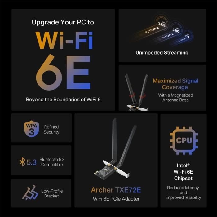 Scheda Wifi Con Bluetooth 5.3 SCHEDA WIFI 6E -AXE3000H PCI-E WLAN Bluetooth 5.2 AX210 Scheda Di Rete Scheda Wifi Pc Fisso 【Standard WiFi 6E】 Ampliato al più chiaro, ampio, e la banda di frequenza di 6 GHz per ottenere una maggiore larghezza di banda e una velocità più veloce; aumenta la tua velocità complessiva a 2402 Mbps (6 GHz) + 2402 Mbps (5 GHz) + 574 Mbps (2,4 GHz). Compra SYONCON Scheda WiFi 6E PCIe AXE5400 Chipset intel AX210 con Bluetooth 5.3 Scheda di rete Wireless PCI Express Adattatore Tri-Bande (6GHz/5GHz/2.4GHz) 5374Mbps per PC fisso Windows 10/11 (Nero). SPEDIZIONE GRATUITA su ordini idonei Per utilizzare Wi-Fi a 6 GHz, l'utente deve utilizzare Windows 11. 【Tecnologia Intel Wi-Fi 6E】 La scheda di rete wireless PCIe con chipset Intel AX210 integra la tecnologia standard 802.11ax più recente. Attraverso la crittografia avanzata di 64 bit e 128 bit WEP, TKIP, 128 bit AES CMP, 256 bit AES GCMP, i dati trasmessi dalla scheda di rete wireless sono protetti da attacchi di hacker. Fornisce due supporti di dimensioni diverse per adattarsi alle diverse dimensioni del tuo computer. 【Crittografia avanzata WAP3】 La funzione di sicurezza avanzata WPA3 offre una protezione sicura per le password personali. Fornisce un tasso di trasmissione dati massimo più elevato fino a 2,4 Gbps nell'intervallo da 80 MHz a 160 MHz e ha una capacità quattro volte superiore rispetto ad 802.11ac. Compatibile con standard 802.11ax/ac/a/b/g/n. 【Bluetooth 5.3】 La tecnologia Bluetooth più recente offre una velocità più elevata e una copertura più ampia, supporta l'audio LC3, offre una qualità audio migliore, un ritardo più basso e una maggiore robustezza per i dispositivi Bluetooth.