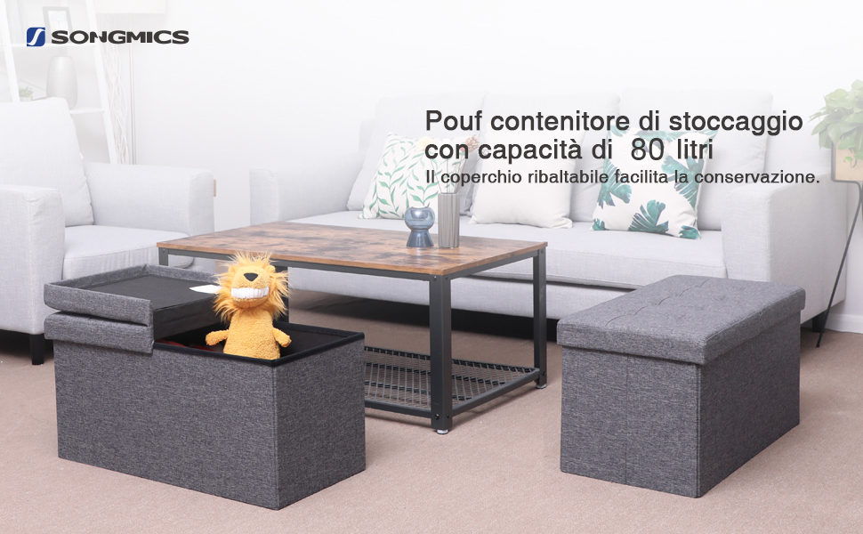 [Multifunzionale] Questo pouf portaoggetti non serve solo come contenitore e poggiapiedi, ma anche come tavolino da caffè! Suggerimenti SONGMICS: Si prega di coprire completamente la cassapanca con il coperchio prima di sedersi sopra. Dimensioni del prodotto: 38 x 76 x 38 cm (P x l x H) Costruito per durare: Progettata pensando alla durata, la panca pouf SONGMICS è caratterizzata da una solida costruzione con spessi pannelli MDF e gli angoli rinforzati. Materiale: MDF (Pannello di Fibre di Legno a Densità Media), Tessuto Effetto Lino, Imbottitura di Gommapiuma Inoltre, funge da comodo sedile o poggiapiedi per il tempo libero. Costruito per durare: Progettata pensando alla durata, la panca pouf SONGMICS è caratterizzata da una solida costruzione con spessi pannelli MDF e gli angoli rinforzati Dettagli del prodotto: Colore: Grigio Ardesia Massimizza lo spazio: Questa cassapanca SONGMICS funge da pratico contenitore e da mobile. Può essere facilmente posizionato in qualsiasi angolo, come in soggiorno, accanto al letto, in corridoio o sotto la finestra Non mettere oggetti di grandi dimensioni nel pouf. Inoltre, funge da comodo sedile o poggiapiedi per il tempo libero. Offre ampio spazio per coperte, libri e altri oggetti, mantenendo la zona di soggiorno organizzata e ordinata. Panca Contenitore SONGMICS Pouf Pieghevole, Cassapanca, 38 X 76 X Cassapanca Contenitore Da Esterno [Seduta confortevole] Il sedile di questa panca contenitore è riempito di spugna ad alta densità e rivestito in tessuto simil lino, offrendo un sedile morbido, traspirante e resistente alla deformazione Può essere facilmente ripiegata per essere riposta, diventando così una pratica soluzione per risparmiare spazio in casa [Ampio spazio] Questa panca portaoggetti da 38 x 76 x 38 cm offre una capacità di 89 litri, perfetta per libri, coperte e altro.