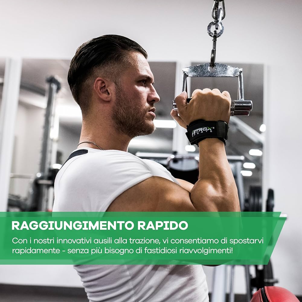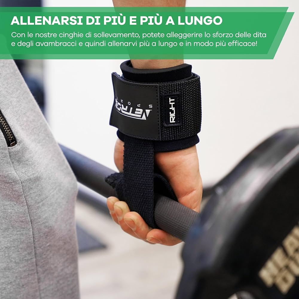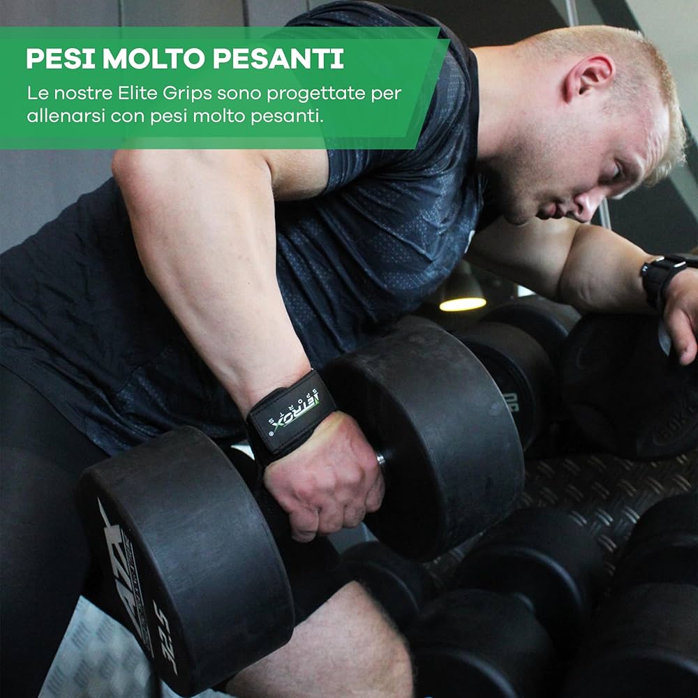 NetroxSports - Power Grips Lifting Straps - Cinghie Palestra con Wrist wraps - Per pesi molto elevati - allevia dita - Sollevamento Pesi - Reverse Grip, Straps Bodybuilding, Gym Strap - Donna e Uomo 4,3 su 5 stelle 1.222 Grazie alle straps e fasce grip, avrai il massimo supporto per allenamenti intensivi, sia per fitness che per bodybuilding Accessori Professionali per Ogni Livello – Le cinghie di sollevamento pesi e le fasce stacco da terra sono perfette per chi cerca prestazioni professionali. Straps Palestra SPORTS - ELITE Grips Lifting Straps - Vera Pelle - Cinghie Pesi Palestra Sviluppate con i bodybuilder – La prima scelta per atleti esperti, offrono una presa eccezionale e supportano sollevamenti fino a 200 kg. Allevia le tensioni su avambracci e dita - I nostri ausili per trazioni in pelle alleviano le tensioni sugli avambracci, come nel caso dei deadlift, in modo da poter allenare i muscoli in modo più specifico.
