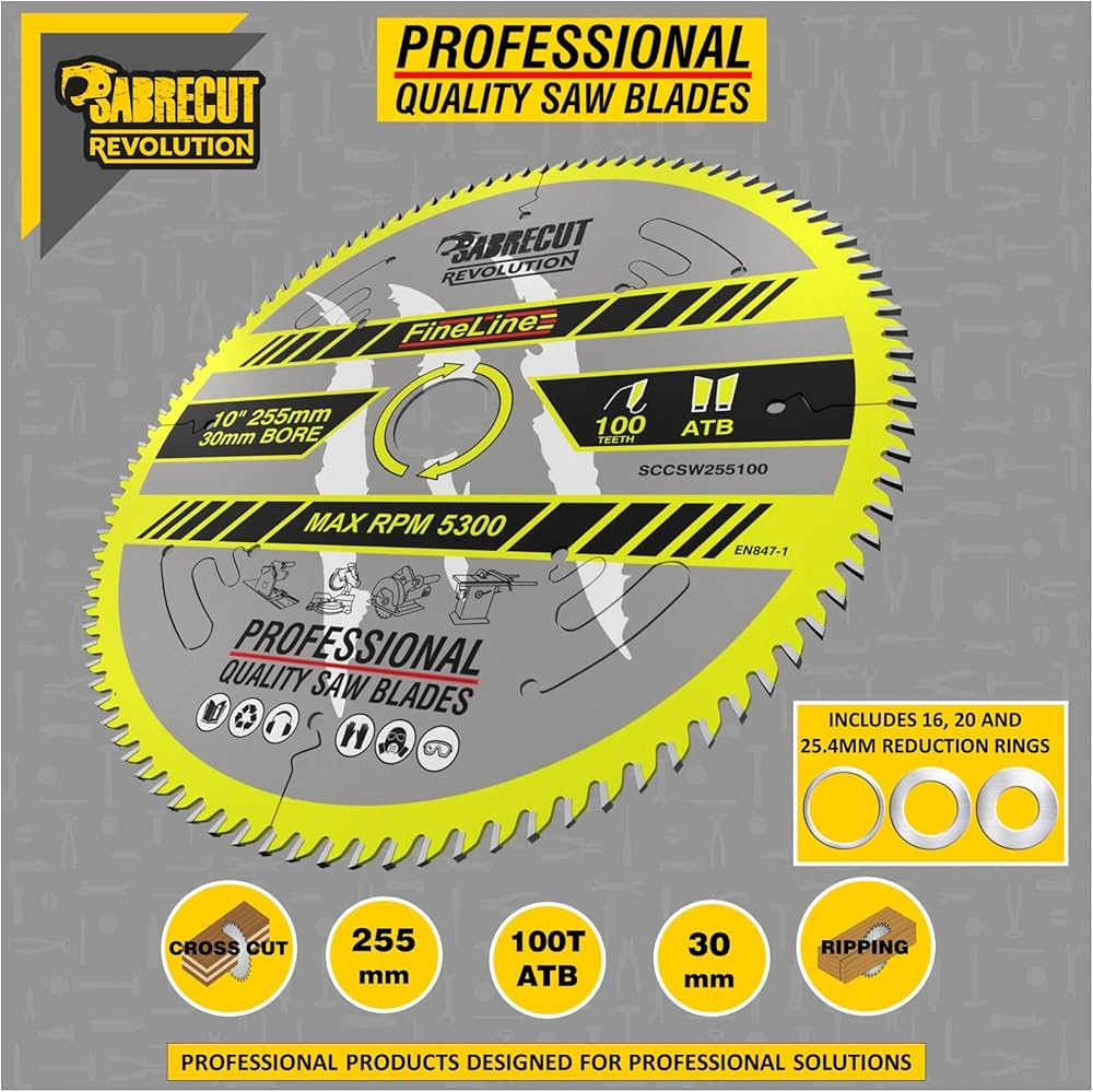 Diametro del foro: 30 mm. Il kit include anelli di riduzione da 25,4 mm, 20 mm e 16 mm Taglia Legno 1 Lama Per Sega Circolare SabreCut SCCSW18580 Da 185 Mm, 80 Denti X 30 Mm, Per Legno Compensato, Truciolato, Truciolato E Taglio A Strappo Sega Circolare Per Legno Le lame per sega circolare SabreCut Revolution FineLine per legno sono adatte sia per macchine con filo che senza fili. Queste lame sono ideali per il taglio trasversale liscio e il taglio a strappo di legno naturale e fogli a base di legno artificiale co Queste lame sono ideali per il taglio trasversale liscio e il taglio a strappo di legno naturale e fogli a base di legno artificiale come compensato, MDF e truciolato. Numero di denti: 100 Max RPM: 5300 Geometria di macinazione: ATB Compatibile con: Bosch, Dewalt, Festool, Hitachi, Makita, Milwaukee e qualsiasi macchina che utilizza una lama da 250 mm con un foro da 30 mm, 25,4 mm, 20 mm o 16 mm. Le lame sono tagliate al laser e includono slot anti rumore e vibrazioni Punte in metallo duro tedesco 20% più grandi. Kit di accessori per lama circolare SabreCut FineLine, 1 pezzo Le lame sono dotate di punte in metallo duro di provenienza tedesca del 20% più grandi per una lunga durata e precisione. Contenuto della confezione: - 1 lama per legno da 250 mm 100T con foro da 30 mm - SCCSW250100 SabreCut FineLine - Lame per sega circolare Le lame per sega circolare SabreCut Revolution FineLine per legno sono adatte sia per macchine con filo che senza fili. Forza di spinta ridotta richiesta dall'utente Taglio laser con fessure anti rumore e vibrazioni. Queste lame sono tagliate al laser e includono slot anti rumore e vibrazioni. Le lame SabreCut FineLine sono dotate di punte in carburo tedesco del 20% più grandi per una lunga durata e precisione.