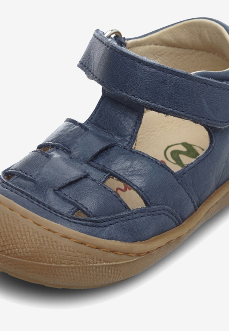 Scarpa semiaperta in nappa blu con punta tonda rinforzata, doppia chiusura e cinturino a t. Tipo di chiusura : VelcroSuola esterna : GommaMateriale interno : PelleSuola interna : PelleMateria esterna : Pelle Con la sua doppia chiusura con strappo e la punta rinforzata assicura un fit modulabile e una protezione ideale. Fodera interna e soletta in pelle, fondo in gomma antiscivolo Scarpe Bambino Estive Sandalo Semi Chiuso Grigio - SEE Sandali Bambina