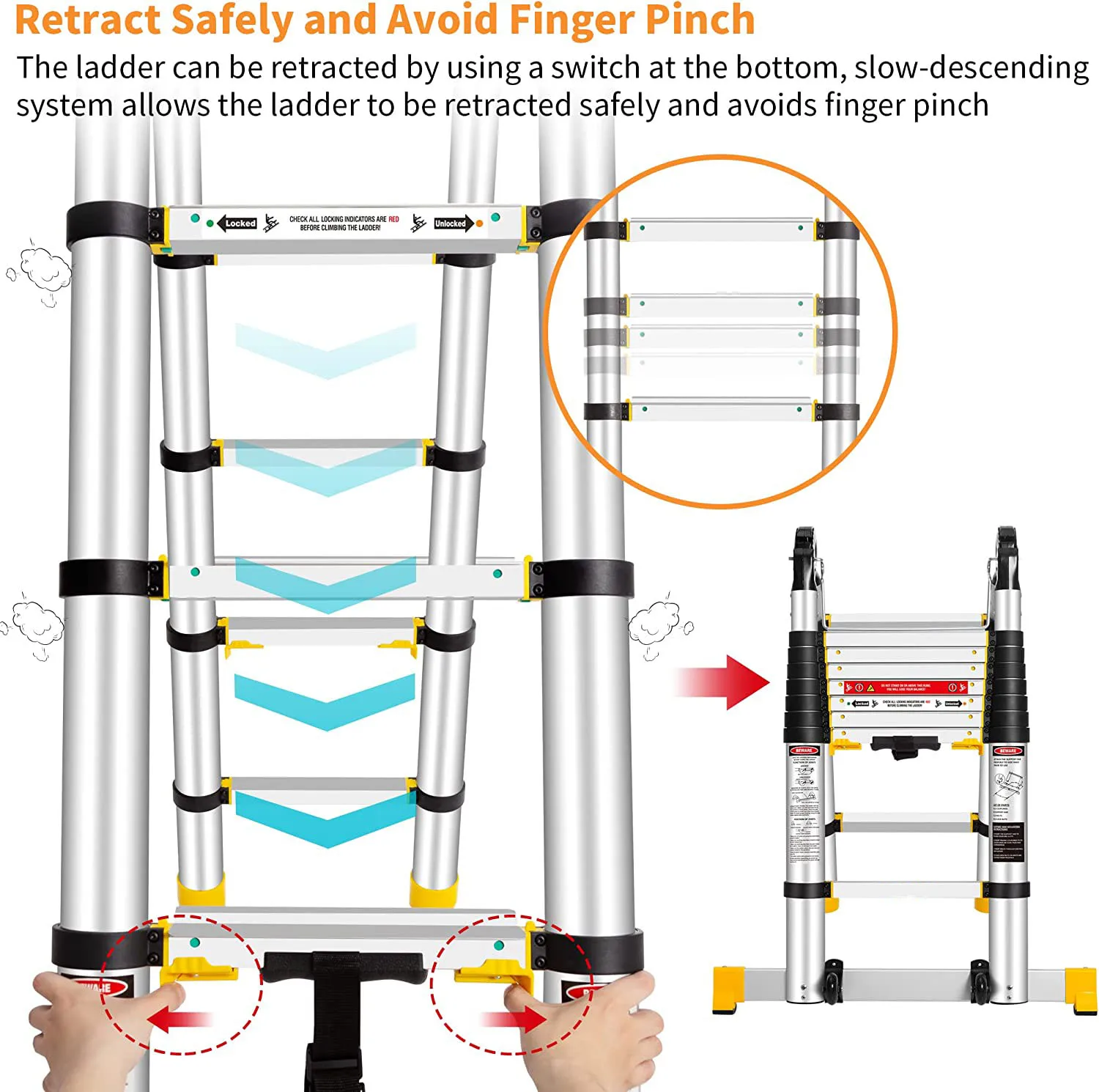 Quindi si apre solo all'altezza richiesta dando grande manovrabilità, soprattutto in piccoli spazi. Scale Telescopiche In Alluminio Prezzi RIG 380 - Scala Telescopica Multiuso, Alluminio Con Gradini In Acciaio, Estensione Massima 3,8 M, Bloccaggio Di Sicurezza Scala Telescopica Alluminio Allungabile Finitura in alluminio anodizzato, pulita al tatto. Peso della scala: 11,3 kg. La scala telescopica è realizzata in lega di alluminio impermeabile e resistente alla corrosione, con un telaio robusto e gradini antiscivolo La scala telescopica telescopica può essere estesa a 3,8 m e compatta fino a 3,9 m. La scala telescopica è realizzata in lega di alluminio impermeabile e resistente alla corrosione, con un telaio robusto e gradini antiscivolo. La nuova alternativa intelligente alle scale convenzionali, la scala telescopica ha molte applicazioni sia di lavoro che di casa. Ha superato la certificazione EN131 e CE e ha le caratteristiche dei materiali sicuri. Contenuto della confezione: 1 x scala telescopica pieghevole. Molto forte, carico massimo 150 kg. Dispone di piedini in gomma montati per proteggere il pavimento interno e dare anche la massima sicurezza. pur essendo solo 11,3 kg di peso - è facilmente trasportato. Numero di passi:13 Materiale: alluminio; piedini in plastica nera. Caratteristiche: protezione delle dita e barra stabilizzatrice. C'è un manicotto in gomma antiscivolo nero nella parte inferiore dei gradini e c'è una chiave di blocco stabile tra due passaggi adiacenti per evitare collisioni e attrito. Barra stabilizzatrice appositamente progettata per un migliore equilibrio.