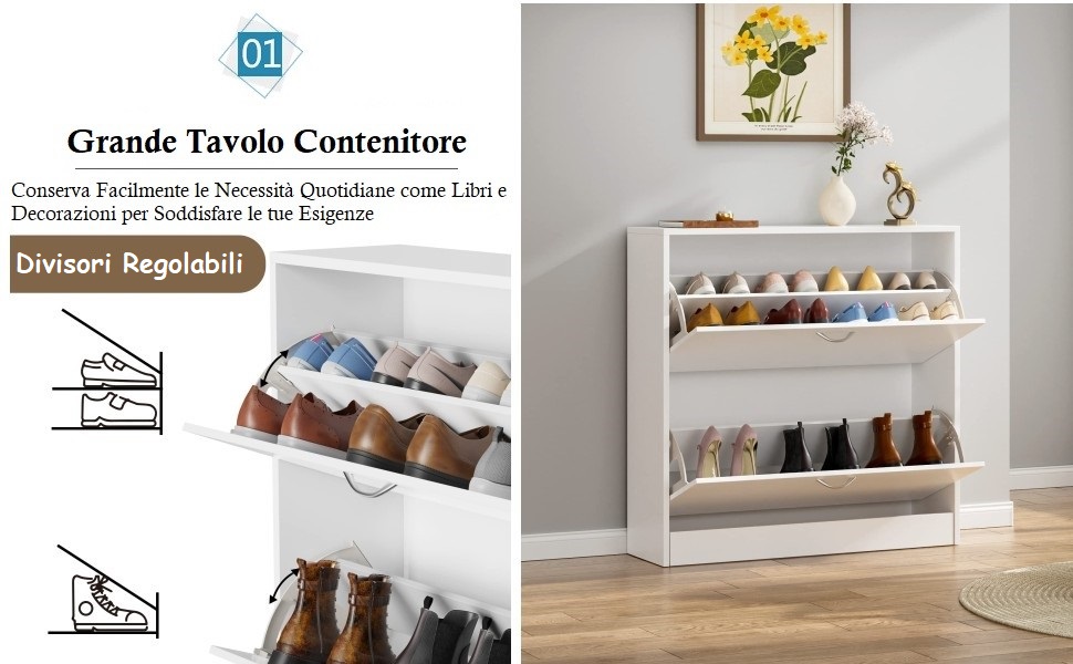 1 x Scarpiera SalvaSpazio Slim a 2 Ante 【Abbellisci la tua casa】: questa scarpiera bianca ha un aspetto minimalista e si abbina bene a tutti gli altri mobili. 【Una scarpiera compatta che offre più spazio】: design pieghevole a doppio cassetto, divisorio interno regolabile che li divide in due scomparti per riporre più scarpe, design ergonomico staccabile per riporre facilmente scarpe con tacco o stivali. Non dovrai più preoccuparti della quantità di scarpe da mettere in ordine! Scarpiera salvaspazio con 2 ante a ribalta, un'organizzazione efficiente che permette di riporre circa 12 paia di scarpe, indipendentemente dal tipo (scarpe da ginnastica, stivali, tacchi...) per mantenere le scarpe organizzate ed evitare la caduta di cenere. Dispositivo antiribaltamento: Il dispositivo antiribaltamento dietro la scarpiera può essere fissato alla parete per proteggere l'incolumità della famiglia. Scarpiera Portascarpe in Legno MDF con 2 Ante Porta Scarpe a Ribalta Bianco Firfurd Scarpiera Realizzata in legno di alta qualità, la scarpiera è abbastanza resistente da contenere le tue scarpe senza mostrare alcun segno di rottura. 【Montaggio senza preoccupazioni】: una scarpiera indispensabile a casa, con dettagliate istruzioni illustrate e accessori necessari per assemblare questa scarpiera verticale, la superficie della scarpiera può essere pulita facilmente e rapidamente con un panno leggero. Nota: non permettere ai bambini di arrampicarsi! Scarpiera verticale ultrasottile: è la scelta migliore! Porta scarpe salvaspazio: spazio di archiviazione La scarpiera ha 2 strati di alette e ogni strato ha 2 scomparti, che ti consentono di posizionare le scarpe in modo ordinato. Fissa questo scaffale autoportante alla parete con l'accessorio antiribaltamento incluso per un uso sicuro. La finitura in vernice bianca e l'aspetto elegante di questa scarpiera possono abbinarsi bene a qualsiasi altro mobile in stili diversi, come corridoio, soggiorno, camera da letto, ufficio. Contenuto della confezione: FirFurd NOTE : I colori visualizzati potrebbero alterare da monitor e dalle impostazioni dello schermo. Scarpiera salvaspazio con 2 ante a ribalta, un'organizzazione efficiente che permette di riporre circa 12 paia di scarpe, indipendentemente dal tipo (scarpe da ginnastica, stivali, tacchi...) per mantenere le scarpe organizzate ed evitare la caduta di cenere Contiene 12 paia di scarpe da donna o 8 scarpe da uomo e può contenere scarpe fino alla taglia 44. 【Scarpiera salvaspazio】: 2 cassetti con maniglie incise sono facili da aprire e chiudere, sfruttando appieno lo spazio verticale per un più facile accesso alle scarpe. Stile moderno: I divisori rimovibili consentono un uso più pratico in base alle proprie esigenze. Salvaspazio Slim Scarpiera FirFurd Scarpiera Portascarpe,Scarpiera Slim Salvaspazio,Scarpiera Scarpiera Salvaspazio In Metallo I dati delle dimensioni manuali potrebbero esserci una deviazione di 1-2 cm. Scarpiera verticale salvaspazio, stile classico, cassetti a doppio ripiano, hai la flessibilità di riporre più scarpe rispetto alla classica scarpiera, molto comoda da usare come scarpiera d'ingresso a casa. La scarpiera è dotata di raccordi antiribaltamento, che possono essere fissati a parete per evitare il ribaltamento. 1 x pacchetto di accessori Descrizione prodotto FirFurd Scarpiera in legno con 2 ante a ribalta! Preoccupato per le troppe scarpe e non sai come conservarle? Questa scarpiera deve essere un prodotto ideale per te! La scarpiera è adatta per essere collocata in corridoi, portici, ingressi di camere da letto, ecc.