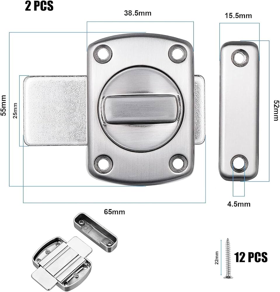 Materiale: lega di zinco Dimensioni: 55 × 40 × 23 mm/2.17 × 1.57 × 0.91 pollici; Fornisce una protezione affidabile Questo sistema è ideale per bloccare la porta di un bagno, WC o la porta di una camera da letto. Questa serratura è spesso dotata di una spia libero/occupato Porta A Soffietto Da Interno Chiavistello Scorrevole Bullone Rotante Bullone Serratura Per Porta Chiavistelli Per Finestre Larghezza del fermo: 25 mm/ 0.98 pollici Suggerimenti amichevoli: Consenti un errore di 3-5 mm dovuto alla misurazione manuale e assicurati che non ti dispiaccia prima di ordinare. Specifiche del prodotto: Colore: argento Serratura Della Porta del Patio Adatto a molteplici scopi come porta dell'armadietto del bagno,ecc.