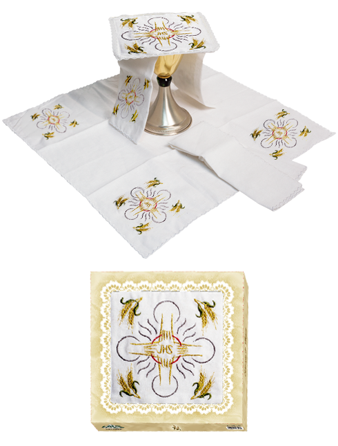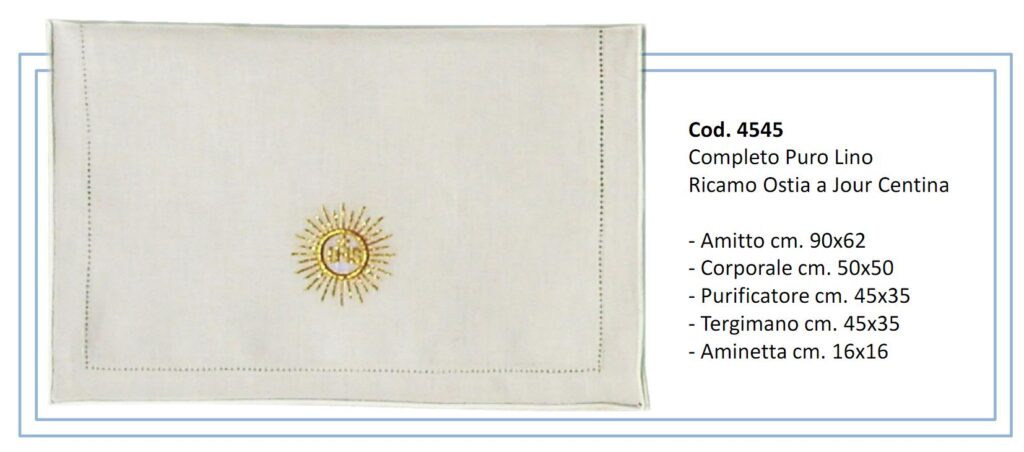 Servizio da altare 100% lino calice ostia uva. Il servizio si compone di 4 pezzi: - palla (17 x 17 cm), - corporale (45 x 45 cm Servizio Da Messa Calice E Pisside In Puro Lino Servizio da messa composto di palla, corporale, purificatoio e asciugamano, realizzato interamente in Italia da una sartoria specializzata. Peso: 0.10 g - : - Materiali Articolo: 100% lino - CODICE PRODOTTO: PM001220