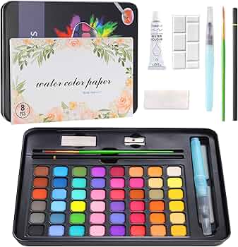 PENNELLI+PENNARELLI+NASTRO+SPUGNA - 10 taglie di pennelli da pittura e 4 pennarelli ad acqua rinfilabili con varie forme, sia che si tratti di dettagli fini o di riempimenti ampio, avrai il pennello perfetto per farlo. La superficie pressata a freddo permette ai pigmenti di diffondersi uniformemente e di essere assorbiti senza alcun risultato imprevisto. Pennello Pittura Funto Set Di Acquerelli, Set Di 48 Colori, 10 Pennelli, 4 Penne A Colori Per Bambini SET COMPLETO DI COLORI AQUARELLI - Include 48 colori di pittura aquarelle solide, 10 pennelli in legno con pelo sintetico morbido, 4 pennarelli ad acqua rinfilabili, 1 quaderno di carta aquarellabile (30 fogli, 140lb/300gsm, 9x12 pollici), 1 nastro da artista, 1 spugna e 1 vassoio per miscelazione. Buona trasparenza, texture morbida e facile da sciogliere con ottime proprietà di miscelabilità. Ottimo REGALO IDEA PER GLI AMANTI DELL'ARTE - Tutto ciò di cui hai bisogno per iniziare il viaggio dell'arte aquarellare, confezionato in una bella scatola regalo, lo rende un meraviglioso regalo per bambini, adulti, studenti, artisti e chiunque ami l'arte. Funto Set di acquerelli, set di 48 colori, 10 pennelli, 4 penne a pennello ad acqua ricaricabili, blocco pagine da 30 (9 x 12), nastro adesivo, spugna, tavolozza, kit di pittura, principianti Tutto ciò di cui hai bisogno per iniziare a dipingere e godere della tua creatività subito. Ogni colore aquarelle è ricchissimo di pigmento e ha pochissimo granulato. La spugna può essere utilizzata per umidificare la carta o levare la pittura.