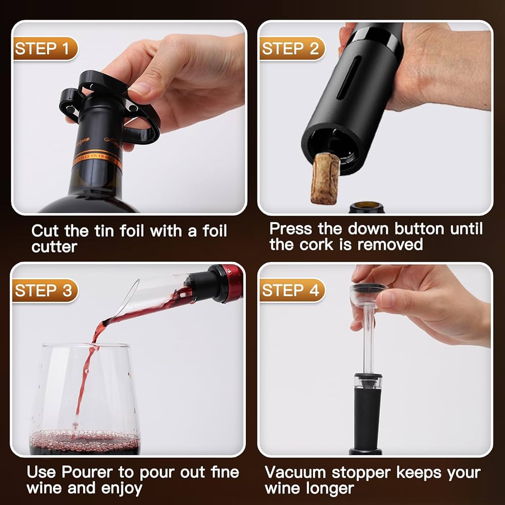 Tappo per vino sottovuoto: il tappo sottovuoto è realizzato con materiali per alimenti e la sua smussatura è progettata per versare in modo sicuro. Il supporto di ricarica è integrato e non sono necessarie batterie. Set apribottiglie elettrico 5 in1 con base di ricarica Cavatappi automatico con versatore aeratore e tagliacapsule per regali da bar da cucina – Ampia scelta di prodotti di alta qualità Cavatappi Elettrico Per Vino Piegricdiat - Set Di Apribottiglie Elettrico, Cavatappi Automatico, Set Regalo Apribottiglie Con Taglierina Per Fogli, Tappo Per Vino E Versatore, Set Di Vino 5 In 1 Per Casa : Amazon.it: Casa E Cucina Set Cavatappi Elettrico La pompa a vuoto preserva evita sprechi di vino e può mantenere la maggior parte del vino e dello champagne aperti freschi fino a 7 giorni. Adatto per Capodanno, San Valentino, anniversari, Natale, festa del Ringraziamento, festa della mamma, festa del papà, lauree e molto altro ancora. Con questo apribottiglie puoi goderti la comodità di aprire bottiglie di vino senza problemi. Regalo perfetto per gli amanti del vino: l'apribottiglie elettrico con base di ricarica è un must per ogni amante del vino, che si tratti di una vacanza, un compleanno o un'occasione speciale, questo set lascerà senza dubbio un'impressione duratura. Design ricaricabile: questo apribottiglie a vite in sughero presenta un design senza fili, che consente di aprire fino a 80 bottiglie con una singola carica di 2 ore.