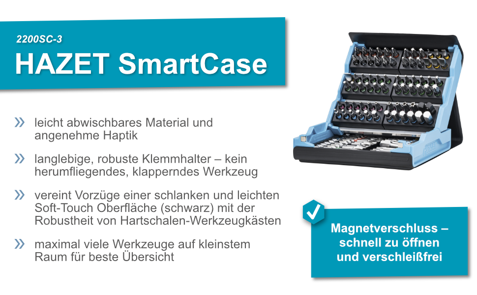SmartHolder 2300SH-1 HAZET Smartcase Set Di Bit 2200SC-3, 96 Pezzi, Attacco Set Cacciaviti Professionali PRATICO: il design a cerniera del set di bit consente di posizionare la scatola ad angolo retto e in posizione completamente aperta, per una migliore visione d'insieme e un accesso più rapido. OGGETTO DELLA CONSEGNA: 1x set di bit HAZET 2200SC-3 Smart-Case | 96 pezzi, set di utensili pieghevole con diverse unità, senza utensili volanti, chiusura magnetica | Dimensioni: 130 x 118 x 50 mm'. HAZET Smartcase set di bit 2200SC-3 , 96 pezzi, attacco : esagono 6,3 (1/4 di pollice), massimo numero di utensili nel minimo spazio per una migliore visione d'insieme, set di utensili pieghevole MADE IN GERMANY: HAZET è uno dei principali produttori di utensili di qualità per uso professionale e vanta oltre 155 anni di esperienza nello sviluppo e nella produzione.