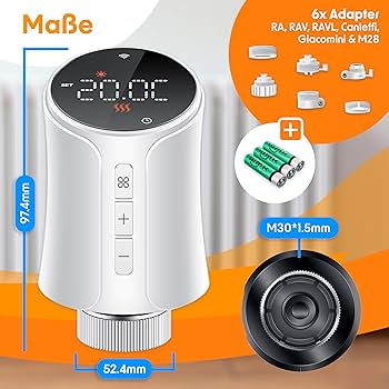 Caratteristiche del prodotto: Controllo app: controllo tramite Smart Life e Tuya Smart App. Modalità antigelo: attivazione automatica a 5 °C. 6 adattatori: compatibile con diverse valvole per radiatori. Facile da usare: il termostato rileva automaticamente quando una finestra è aperta e spegne il riscaldamento per evitare sprechi di energia. Adattatore: compatibile con RA, RAV, RAVL, Canleffi, Giacomini, M28 Tappo a vite: M30 x 1,5 mm. Display: LCD. Questa funzione garantisce regolazioni precise e ottimizza il comfort di riscaldamento evitando sprechi di energia causati da misurazioni errate. Controllo genitori: previene modifiche indesiderate. Questa funzione contribuisce in modo significativo all'efficienza energetica e consente di risparmiare sui costi evitando il riscaldamento non necessario durante la ventilazione. Funzione anti-gelo: protezione contro i danni da gelo. Facile da usare: grazie alle Smart Life e alle app Smart Tuya Smart è possibile controllare il termostato KESSER comodamente dal divano, dall'ufficio o in viaggio. Facile da usare: il termostato KESSER viene fornito con 6 adattatori compatibili con diverse valvole per radiatori, tra cui RA, RAV, RAVL, Canleffi, Giacomini e M28. Ciò consente un'installazione semplice e flessibile, che può essere adattata alla maggior parte dei sistemi di riscaldamento. Rilevamento apertura finestra: il riscaldamento si spegne con la finestra aperta. KESSER® Set di 4 termostati per termosifoni WiFi, termostato per riscaldamento Wi-Fi con controllo app Smart Home, termostato Alexa, Google Assistant con 6 valvole per radiatore, risparmio energetico Il termostato di riscaldamento KESSER è completamente compatibile con Google Assistant e Amazon Alexa, in modo da poter regolare la temperatura della vostra casa semplicemente tramite comando vocale. Funzionamento ECO: risparmio energetico a 15°C Modalità comfort: preimpostato a 20 °C. Amazon Alexa KESSER® Radiator Thermostat Set Of 4 WiFi Heating Controllers, Heating Thermostat WLAN With Smart Home App Control, Thermostat Alexa, Google Assistant Regolare Il Termostato Wifi Display LCD: visualizza tutte le informazioni pertinenti. Regola la temperatura in incrementi di 0,5 C e goditi la flessibilità che la tua vita moderna richiede con il controllo completo direttamente dal tuo smartphone. Utilizza comodi comandi come Ehi Alexa, imposta la temperatura in salotto a 22 ° C e sperimenta la comodità del controllo vocale del riscaldamento. Tappo a vite M30 x 1,5 mm: montaggio semplice.