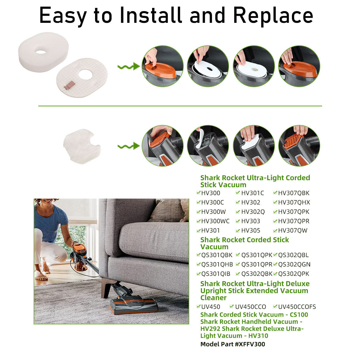 Shark Rocket HV300, HV301, HV302 HV305, HV310, Replacement Foam & Filter Set Replaces Shark Part