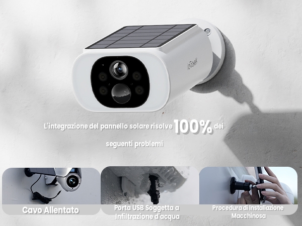 Telecamera S1 Pro con pannello solare incorporato Video del venditore Videocamera Sorveglianza Esterno ZUMIMALL Telecamera Di Sorveglianza WiFi Con Pannello Solare, Telecamera Di Sorveglianza WiFi Telecamera Wifi Esterno Rispetto ad altre telecamere con pannelli solari esterni, l'efficienza di ricarica è aumentata di oltre il 50%. La telecamera può inoltre essere collegata a un pannello solare. Le migliori offerte per ieGeek 5MP Telecamera Wifi Esterno Senza Fili, 360° PTZ Batteria Pannello Solare sono su Confronta prezzi e caratteristiche di prodotti nuovi e usati Molti articoli con consegna gratis (*Dati dei test in ambiente di laboratorio) 🌞 Alimentazione solare Pannello di ricarica solare ad alta efficienza incorporato, con batteria ad alta capacità da 5200 mAh, 2 ore di accumulo rapido di energia quando il sole è pieno, completamente privo di cavi di alimentazione, per risparmiare sui costi di installazione. Descrizione prodotto ieGeek -- Making Security Simpler 🚶【Rilevamento intelligente & notifica tempestiva】: la telecamera esterno è dotata della più recente funzione di analisi intelligente AI, in grado di identificare con precisione persone, animali domestici e pacchi e di inviare avvisi in tempo, mentre l'APP riceverà la notifica di allarme entro 1s. 1 Luce Più Uniforme 2 H. Tenere al sicuro la vostra famiglia non è mai stato così facile! Nuova versione della telecamera ieGeek S1 5MP! Pannello solare incorporato, l'elettricità viene fornita direttamente alla telecamera. Opzioni di Ricarica Multipla Due pannelli solari che funzionano contemporaneamente possono aumentare l'efficienza di carica della batteria di oltre il 200%. (Il rilevamento del movimento umano PIR di base è disponibile gratuitamente, l'intelligenza artificiale intelligente deve essere pagata per essere utilizzata). 📱Uso di più dispositivi & garanzia del marchio ieGeek La telecamera esterno senza fili supporta i dispositivi mobili del sistema Android & IOS, ed è anche compatibile con Alexa, orologi intelligenti.