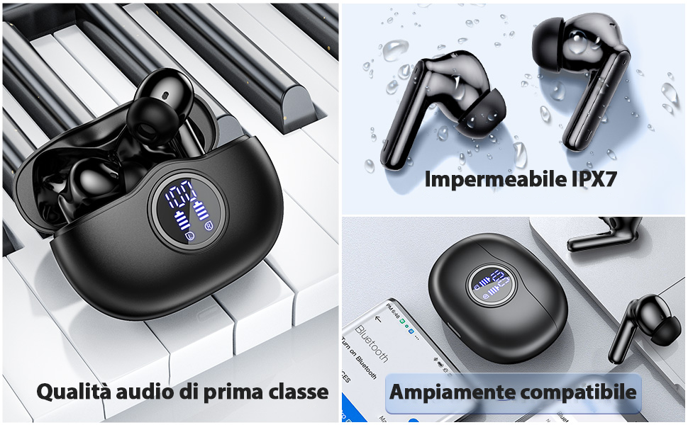 Le cuffiette wireless si collegano facilmente a una varietà di dispositivi abilitati Bluetooth, tra cui smartphone iOS e Android. cuffie bluetooth cuffie bluetooth Adotta il rivestimento impermeabile IPX7, efficacemente impermeabile. Cuffie bluetooth utilizzano un altoparlante dinamico da 13mm, garantire bassi potenti. Microfono HD integrato, garantire che l'altro lato possa sentirti chiaramente. Controllo Touch e Compatibilità Universale: L'cuffie Bluetooth senza fili adotta la tecnologia di controllo tattile con sensore tattile ad alta sensibilità, possono ottenere il massimo controllo senza utilizzare il telefono, incluso volume +/-, brano precedente/successivo, rispondere/terminare la chiamata e l’assistente vocale della chiamata e altre funzioni. Impermeabilità IP7 e Design Ergonomico: Le auricolari bluetooth sport hanno un nanorivestimento, quindi non devi preoccuparti che vengano danneggiate da acqua, sudore o pioggia. Le cuffiette wireless possono essere utilizzate ascoltare musica per un massimo di 6-8 ore con una singola carica, e la custodia di ricarica inclusa fornisce 4 ulteriori ricariche, per una riproduzione totale di 40 ore, offre compagnia duratura e recupero immediato della carica. Tecnologia Bluetooth 5.3 avanzata: Le cuffie wireless utilizza una versione aggiornata del chipset Bluetooth 5.3, Il consumo energetico è ridotto del 30%, offrendo un'esperienza di ascolto stabile e a bassa latenza entro un raggio di 15 m. Le bluetooth earphones adottano interruttori di sala, si collegheranno automaticamente al telefono dopo l'associazione per la prima volta, non è richiesta alcuna operazione manuale. 1 Suono Eccezionale 2 ENC Chiari Chiamate 3 Bluetooth 5.3 4 IPX7 Impermeabile 5 Design ultraleggero Auricolari Bluetooth Samsung Cuffie Bluetooth, Auricolari Bluetooth 5.3 Stereo HiFi Con 4 HD Mic, Cuffie Wireless In Ear ENC Cancellazione Rumore, 40 Ore LED Display Touch Control, Cuffiette Bluetooth IP7 Impermeabili, Bianco Cuffie Bluetooth Jbl Suono Eccezionale e ENC Chiari Chiamate: Csasan Cuffie bluetooth utilizzano un altoparlante dinamico da 13mm e aggiungono un design a diaframma composito per evitare la distorsione del suono e garantire bassi potenti e una chiarezza stereo ad alta fedeltà. Ogni auricolare pesa solo 4 grammi e non è gravoso da indossare per lunghi periodi di tempo.