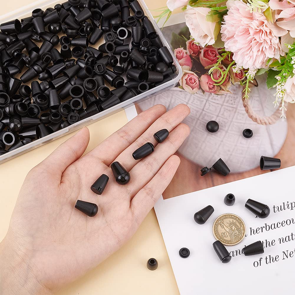 PandaHall 150pcs 5 SizesCord Lock Stopper, Bell End Stopper Black Cone Plastic Cord End Nylon Detachable Cap Cord Cord Rope Fastener Ends For Lanyard
