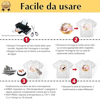 Ottima per trasferire immagini, foto o testo, su qualsiasi stoffa chiara stirabile, con il ferro da stiro o termopressa. Crea la tua maglietta personalizzata con i ricordi di una vacanza estiva, foto di gruppo, foto di famiglia, ecc. 5 fogli di carta trasferibile termoadesiva - 100% SODDISFATTI O RIMBORSATI; Perfetta per tessuti bianchi o di colore chiaro come magliette, copricuscini e grembiuli; Ottima per trasferire immagini, foto o testo, su qualsiasi stoffa chiara stirabile, con il semplice uso del ferro da stiro Fogli A4 Per Stampante Raimarket Carta Transfer Termoadesiva Stampa Su Tessuto DIY, Trasferibile |10 Fogli A4| T-shirt Di Colore Chiaro : Amazon.it: Casa E Cucina Carta A4 Formula studiata per far si che il tessuto dopo la stampa rimanga morbido, flessibile, senza crepe e lavabile in lavatrice. Può essere tagliata facilmente con qualsiasi forbice, ma anche con plotter Trasferisci i tuoi lavori su una vasta gamma di tessuti, stoffe e abbigliamento come t-shirt, federe, tutine per bambini e molto altro ancora Utilizzando l'inchiostro normale, a base di colorante dye o pigmentato. 40 fogli.