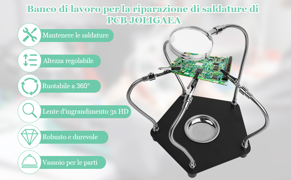 RUIZHI Aiutando le Mani , Terza Mano Aaldatura Stazione di Saldatura con Lente di Ingrandimento 3X per Riparazione Elettronica Assemblaggio Pittura Le braccia flessibili la lunghezza è circa 30 cm, la base in alluminio può essere regolabile e abiti per 5-50mm tabella di spessore. Le braccia flessibili la lunghezza è circa 30 cm, La base in alluminio può essere regolabile e abiti per 5-50mm tabella di spessore. Il pacchetto contiene: Due bracci flessibili con clip girevoli + antiscivolo base in alluminio. Il pacchetto contiene: due bracci flessibili con clip girevoli + antiscivolo base in alluminio, è facile usare e trasportare. Terza Mano Supporto A 5 Bracci Flessibili E Base In Alluminio CNC Stazione Di Saldatura Removibile rotante morsetti a coccodrillo, può contenere il tuo progetto e ruotare 360 gradi, ogni clip Viene con rimovibile maniche in gomma morbida e non può graffiare i tuoi articoli.
