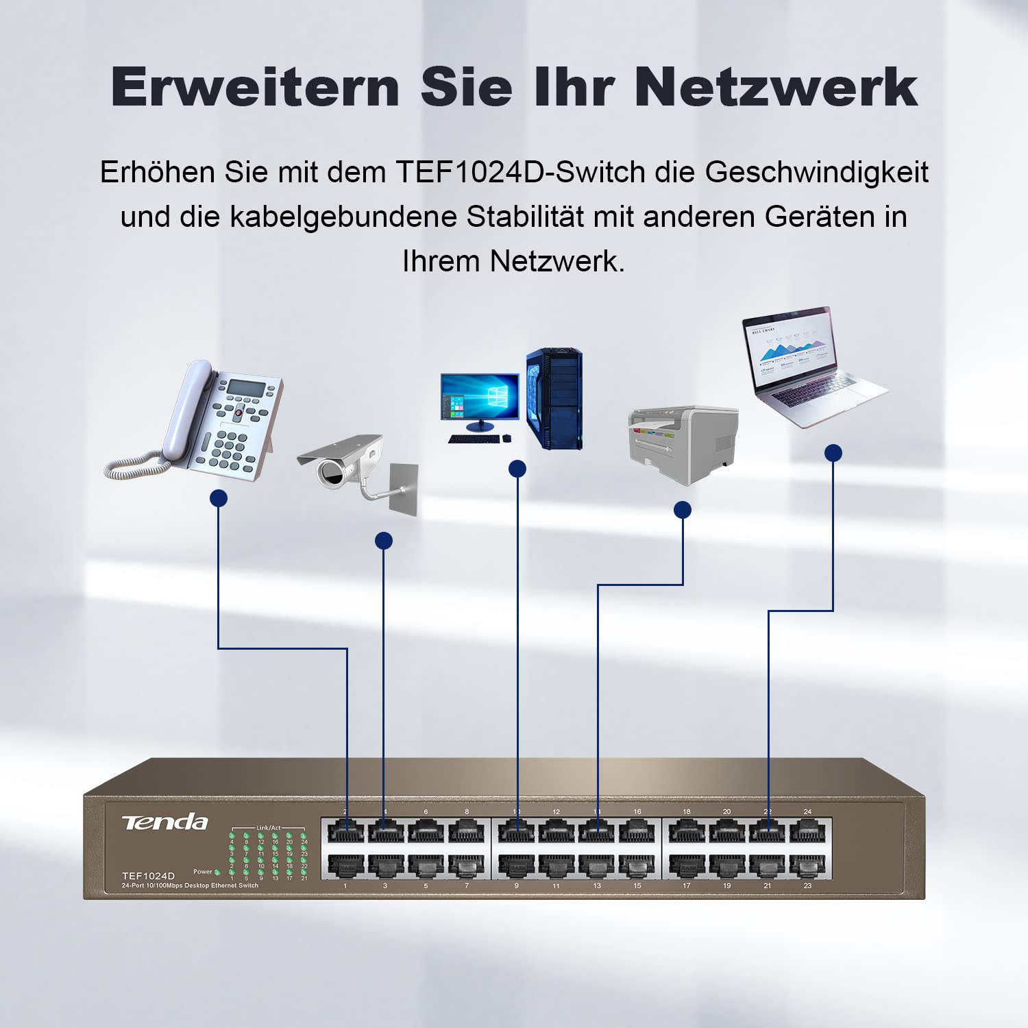 sostegno standard da 13/19 cm per montaggio su parete; supporta sistema Plug and Play che non richiede configurazione. The Tenda TEF1016D/ TEF1024D 16/ 24 -Port 10/100Mbps Switch is specially engineered to provide simple solution to expand SMB networks and campus networks at the best possible cost. Connect this 16/ 24 -port switch to a router and add up to fifteen more co tabella degli indirizzi MAC 8K con informazioni relative e riferimenti temporali, controllo del flusso dei dati per una trasmissione efficiente; larghezza di banda duplex fino a 200 Mbps su ogni porta; Fino a 200Mbps di larghezza di banda full duplex su ciascuna porta Il buffer dinamico controlla il bilanciamento del carico di rete, impedisce il blocco del procedimento d'invio dati e controlla automaticamente gli errori in fase d'invio, garantendo l'integrità e la protezione dei dati stessi. Semplice ed ergonomico per un'espansione di rete in SMB e Campus Caratteristiche principali: 24 porte auto-rilevanti commutate a 10/100 Mbps con rilevamento automatico d'interscambio MDI/MDI-X; Lo switch 24 porte 10/100 Tenda TEF1024D è progettato appositamente per fornire una soluzione per l’espansione di rete in SMB. Access Point Switch Tenda Fast Ethernet De 24 Portas 10/100 Mbps - Tef1024d | All Switch Poe
