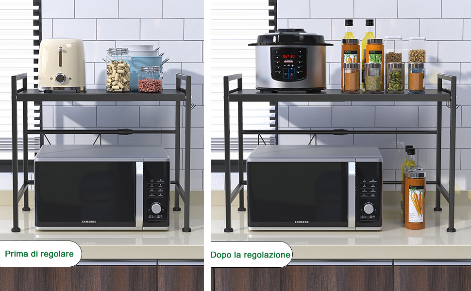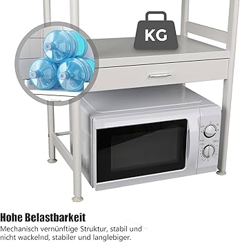Facile da pulire, la superficie liscia dello scaffale microonde consente una manutenzione semplice e veloce. Garantisce stabilità e durata nel tempo, senza rinunciare allo stile industriale e rustico. SOLUZIONE FUNZIONALE E VERSATILE: Con design a 2 ripiani, questa mensola sopra microonde può essere utilizzata come porta utensili da cucina o scaffale per l'ufficio, ideale per riporre microonde, barattoli di spezie, lattine, ecc.. MATERIALE DI ALTA QUALITÀ E RESISTENZA: Realizzato con pannelli spessi e tubi di ferro robusti, questo ripiano microonde può sopportare pesi fino a 30 kg. Ideale per superfici irregolari, la sua struttura affidabile garantisce la tua sicurezza. Salvaspazio TBGJSYY Mensole Cucina, Mensola Microonde Porta Forno A Microonde Con Cassetto, Supporto Per Tostapane Da Cucina Per Piano Di Lavoro, Stoviglie Per Utensili Da Cucina A 2 Livelli, Ripiano Per Microo Mobiletto Cucina DIMENSIONI COMPATTE E STABILITÀ OTTIMALE: Le dimensioni ridotte del supporto per microonde lo rendono adatto a diversi spazi, con piedini regolabili per una stabilità ottimale.
