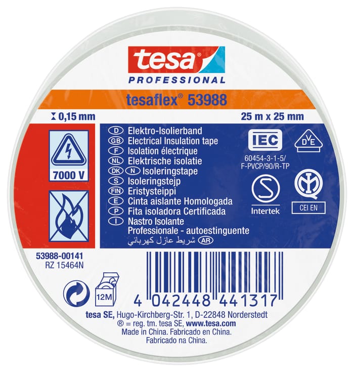 Compre 53988-00138-00 - TA - Cinta de Aislamiento Eléctrico, PVC (Policloruro de Vinilo), Negra, 25 m x 25 mm. Farnell paña ofrece cotizacion rápidas, dpacho el mismo día, entregas rápidas, amplio inventario, hojas técnicas y soporte técnico. Prec Tesa Flex 53988 Data Sheet TESA® Cinta Aislante Homologada SPVC Profesional 53988 Negro - Pack De 4 Rollos De 25m X 50mm 0051111922927 Tesa 53988 Datasheet nastro isolante tesa imq nero 25 metri supporto in pvc plastificato massa adesiva gomma naturale tensione di ripartizione 7000v norma iec 60454-3-1-5 certificato imq 25 mm dimensioni del pacchetto: 10.0 l x 10.0 a x10.0 l (cm)