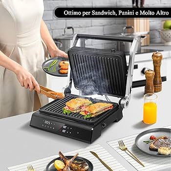 rivestimento elettrica bistecchiera 2000w tostapane griglia antiaderente Inoltre, dispone di una protezione per il controllo della temperatura, che rende l'uso più sicuro per voi. Temperatura regolabile: con la manopola regolabile è possibile regolare la temperatura di cottura (circa 212-482 ℉) in modo che corrisponda alle tue papille gustative preferite, sia delicate che succose, medie o cotte. Piastra Elettrica Per Grigliare TIXBYGO Griglia A Contatto Panini Grill Tostapane, Apertura A 180 Gradi, Rivestimento Antiaderente, In Acciaio Inox Panini Maker, 2800 W, Tostapane A Sabbia, Temperatura Regolabile Piastra Elettrica Per Cucinare Stile di vita sano: grazie al rivestimento antiaderente per alimenti, è necessario utilizzare solo poco burro o olio da cucina durante la cottura per ottenere pasti leggeri deliziosi e sani. 【Robusto e durevole】Il prodotto è realizzato in bachelite di alta qualità, lega di alluminio e acciaio inossidabile, con tecnologia di rivestimento, ad alta resistenza, resistenza all'usura e lunga durata.