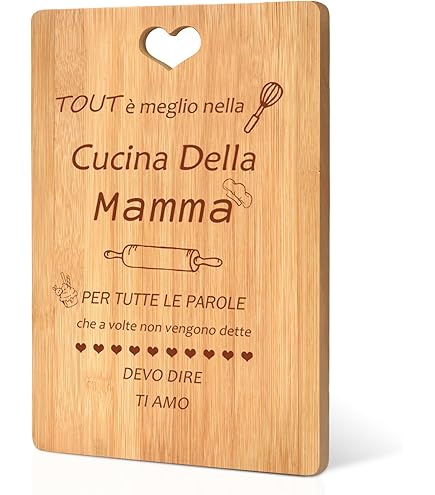 REGALO MAMMA TAGLIERE: Nostro tagliere è inciso con parole calde ed è il regalo perfetto per il tua mamma che ama cucinare per fargle sapere quanto le vuoi bene. Idee regalo per miglior mamma Regalo Mamma , Regalo Mamma , Tagliere in Legno Premium Regalo per Mamma , Regalo Mamma Compleanno, Festa della Mamma Natale Regalo per Mamma , 28 x 21 x 1.2 cm Mamma usa sempre questo tagliere per preparare del cibo delizioso per i suoi figli REGALO FESTA DELLA MAMMA: Nostro tagliere è un'ottima aggiunta alla cucina di mamma. PERFETTA DECORAZIONE: Tagliere di nostro mamma è inciso con un testo caldo su un lato e sarà una bellissima decorazione sul tavolo. REGALO FESTIVAL PER MAMMA: Questo tagliere in legno per mamma è adatto a diverse occasioni, come regalo compleanno mamma, regalo per la festa della mamma, Ringraziamento, regalo di Natale e qualsiasi regalo di festa Alta Qualità Legno: Legno di acacia selezionato ad alta densità, con colori e texture molto belli, non si deforma né si crepa e può essere utilizzato per molti anni con una corretta manutenzione. Verrà fornito anche il servizio post-vendita. Prodotto Dettagli: Materiale: legno Dimensioni: 28×21×1,2 cm Peso del prodotto: 390 g Clienti Assistenza: Ci concentriamo sull'esperienza del cliente, fornendo un servizio clienti cordiale e un'assistenza entusiasta. Idee Regalo 10 Maggio Mamma Regalo Festa Della Mamma, Tagliere Di Bambù, Regalo Mamma Festa Della Mamma Idee Regalo