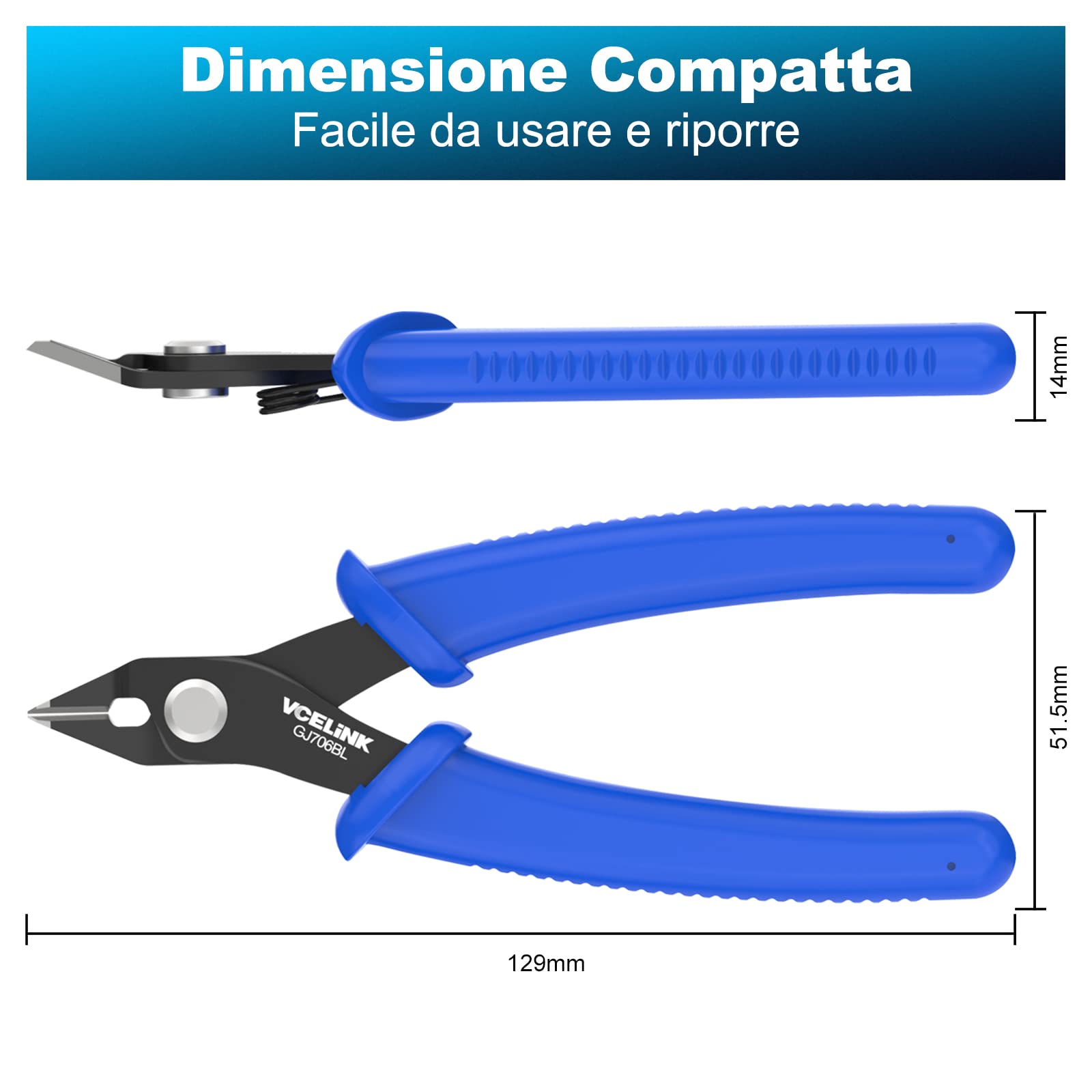 Testa di taglio angolata a 21° per non avere problemi a tagliare i fili. Applicazioni di taglio a filo per filo morbido fino a 16 AWG (1,3 mm 【Applicazione】le taglierine laterali elettroniche possono essere utilizzate per tagliare filo di rame da 0-2 mm (12-46 AWG), modellismo, linee di componenti in eccesso, bordi in plastica, fascette per cavi, gioielli, sigarette elettroniche, piccoli dispositivi elettronici, stampanti 3D, circuiti di bordo, eccetera. 【Affilato e durevole】 Le mini pinze per fili sono realizzate in acciaio al carbonio, non facile da ossidare e arrugginire, elevata durezza, bordo affilato, taglio pulito, non facile da rompere, che garantisce una maggiore durata. Cutter Professionale Pinze Per Taglierine Di Precisione, Tronchesino Modellismo Per Il Spelafili Elettricista 【Super durezza】 Le mini frese laterali sono realizzate in acciaio al carbonio, non facile da ossidare e arrugginire, elevata durezza HRC51-53, bordo affilato, taglio pulito, non facile da rompere, che garantisce una maggiore durata. 【Multifunzione 2 in 1】La spelafili multifunzione Swsdee può spelare rapidamente fili pieni da 20, 18, 16, 14, 10 AWG; La lama affilata trattata termicamente ad alta frequenza consente tagli rapidi anche su fili spessi.