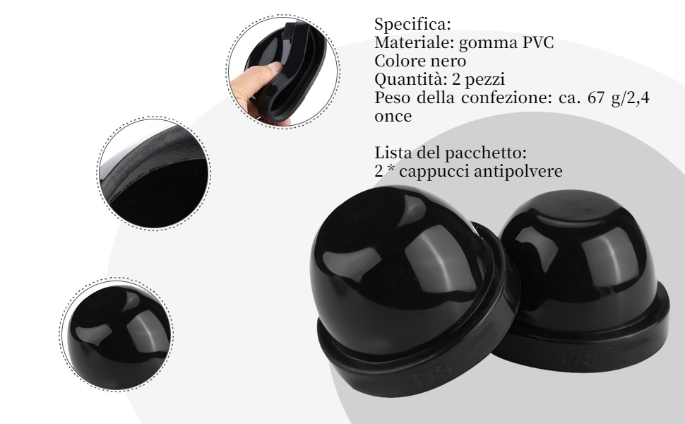 per tappi posteriori maggiorati fanale fiat 500 seconda serie Cappucci antipolvere-2 pezzi 75mm LED faro antipolvere a prova di polvere impermeabile custodia in gomma PVC tappi di copertura per protezione retrofit faro per parapolvere faro auto 75 Parametri di specifica Materiale: gomma PVC, colore: nero, dimensioni: 75 mm, quantità: 2 pezzi, peso dell'imballaggio: circa 67 grammi / 2,4 once. Descrizione prodotto Cappucci antipolvere-2 pezzi 75mm LED faro antipolvere a prova di polvere impermeabile custodia in gomma PVC tappi di copertura per protezione retrofit faro per tappi posteriori maggiorati fanale fiat 500 seconda serie Parametri di specifica Materiale: gomma PVC, colore: nero, dimensioni: 75 mm, quantità: 2 pezzi, peso dell'imballaggio: circa 67 grammi / 2,4 once. 【Impermeabile e antipolvere】 Il cappuccio parapolvere del faro ha una buona prestazione di tenuta, che può proteggere bene i componenti dell'illuminazione dalla condensa dell'acqua, dall'umidità e dalla polvere. 【Produzione professionale】 La copertura del faro è prodotta da un produttore professionale, con alta qualità, qualità garantita e affidabile. per tappi fari 75 Se non sei sicuro che sia adatto alla tua auto, contattaci. per tappi fari led Non importa quale sia il tempo, non si indurirà o si spezzerà nel tempo. 67 g / 2,4 once Elenco dei pacchetti: 2 * Cappucci antipolvere Coperchio Faro Auto 2 Pezzi 75 Mm LED Faro Anteriore Antipolvere In Gomma Impermeabile Tappi Di Copertura Della Guarnizione Dell'alloggiamento Parapolvere Faro Auto 75,tappi Faro Adatto Per Alfa Adatto Per Romeo 147,tap : Amazon.it: Auto Tappi In Gomma 【Parametri di specifica】 Materiale: gomma PVC, colore: nero, dimensioni: 75 mm, quantità: 2 pezzi, peso dell'imballaggio: circa 67 grammi / 2,4 once. Specifica: Condizione: 100% nuovo di zecca Materiale: gomma PVC Colore: nero Dimensioni: come mostrato nell'immagine Quantità: 2 pezzi Peso del pacchetto: ca.