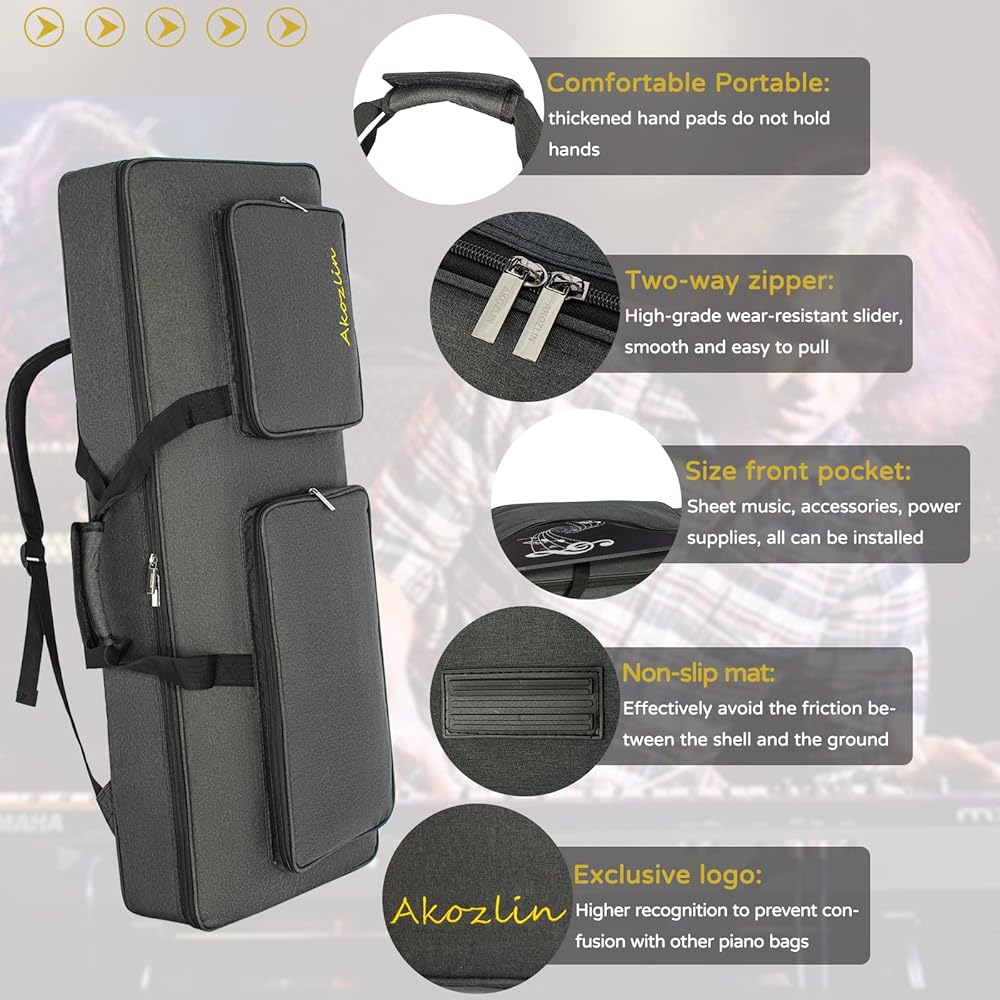 Materiale: questa borsa per pianoforte a 61 tasti è realizzata in tessuto Oxford impermeabile e antipolvere; l'interno del panno di cotone spesso 10 mm può proteggere la tastiera da danni, bloccare anche sporco e fuoriuscite, ed è facile da pulire. La borsa per tastiera a 61 tasti è una borsa elettronica decente per attrezzature. AKOZLIN Custodia per tastiera portatile, resistente, imbottita, universale, impermeabile, in tessuto Oxford, con imbottitura in perle da 10 mm, 49 tasti - Lunghezza 85,3 cm, moderno Custodia Imbottita Per Tastiera Portatile A 61 , In Tessuto Oxford, Nero Tastiera 88 Tasti Le sue tasche offrono molto spazio per tutti i cavi, libri musicali. Regalo perfetto per donne e uomini: davvero consigliabile a chiunque cerchi una borsa per tastiera per pianoforte, borsa da concerto di qualità per riporre la casa, viaggi, trasporti casuali o qualsiasi altra attività rigorosa, perfetta per riporre e trasportare leggero. La borsa per tastiera AKOZLIN è abbastanza buona da contenere la tua tastiera preferita. Impermeabile e antipolvere: offre un'esperienza di utilizzo confortevole ed è anche facile da pulire e mantenere. Dimensioni: 105,9 x 43,9 x 16 cm.