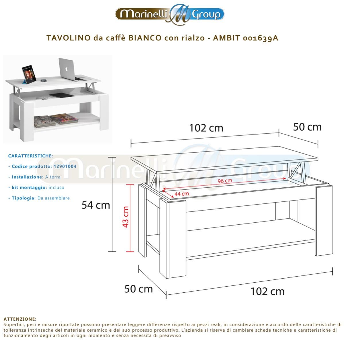 Tavolino Pieghevole Tavolino Caffe Trasformabile In Grande Tavolo Quadrato Tip Tap Tavolino Salotto Descrizione prodotto Tavolo apribile 100 X 50 X 43 con rialzo salvaspazio per soggiorno, sala da pranzo, cucina e giardino. TAVOLINO da caffè 001637BO BIANCO con rialzo · Misure: cm. L100 x P50 x H42 · Misure aperto: cm. L100 x P50 x H55 · Finitura: bianco Avviso di sicurezza Attenzione: rischio di pinzamento durante l'apertura/chiusura. FINITURA: antigraffio e facile da pulire | SPEDIZIONE: inclusa, rapida, gratuita e assicurata GARANZIA: italiana di 2 anni | CONFORMITA': marchio CE MONTAGGIO: rapido e veloce | MATERIALE: melaminico (materiale plastico termoindurente, molto resistente, antigraffio e indeformabile al calore) MODELLO: stile moderno che si adattera' meglio alla tua cucina o alla sala da pranzo | TIPOLOGIA: sollevabile