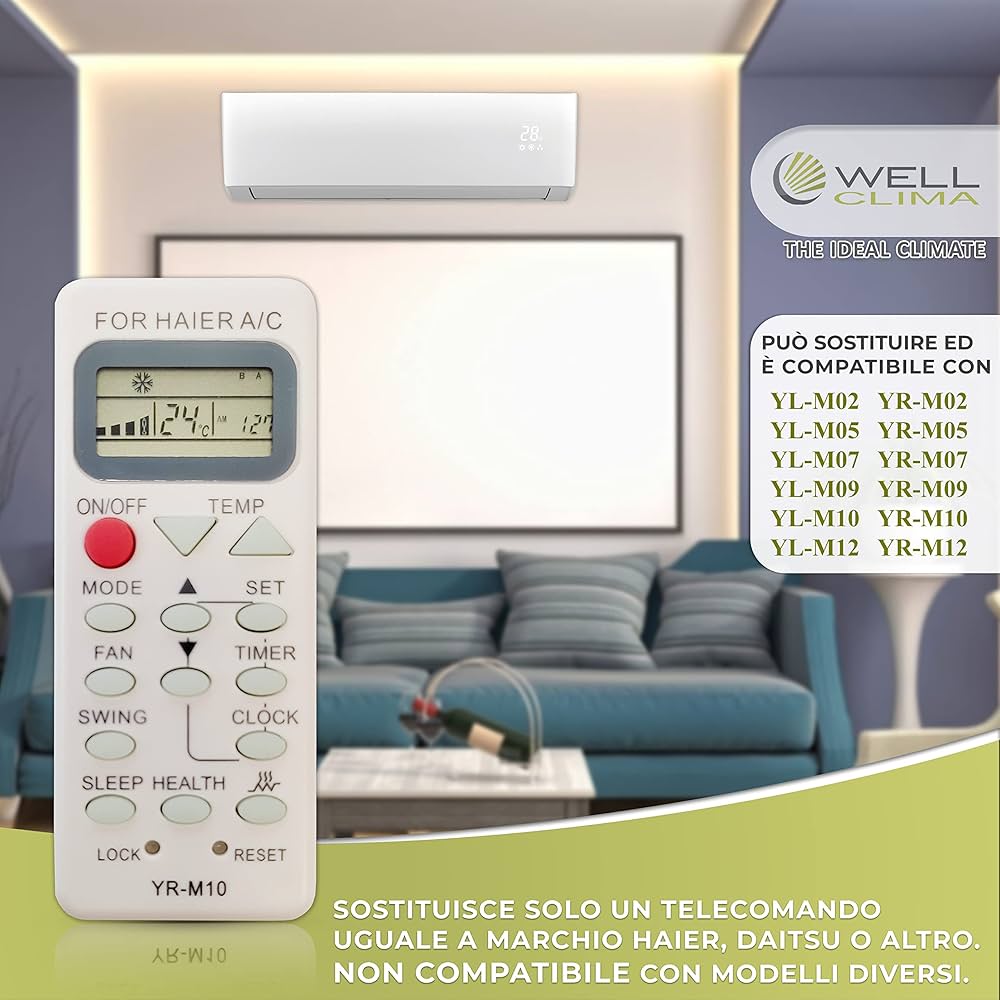 Ogni telecomando condizionatore Haier è intuitivo e semplice da utilizzare, per impostare con facilità le principali funzionalità del climatizzatore. ... Tra i modelli di telecomando per condizionatore Haier : - YR-HE ... Via Marconi, 96 31020 Revine Lago Alimentazione: 2 batterie alcaline AAA (non incluse) È facile da usare, poiché non necessita di alcuna programmazione o configurazione. Telecomando Condizionatore Haier Telecomando Per Climatizzatori Haier YR-HQS01 Telecomando Haier Tv Le funzioni sono le stesse dell'originale. VINABTY Telecomando sostitutivo compatibile con climatizzatore Haier A/C 0010401511AE YL-HD13 YLHD13