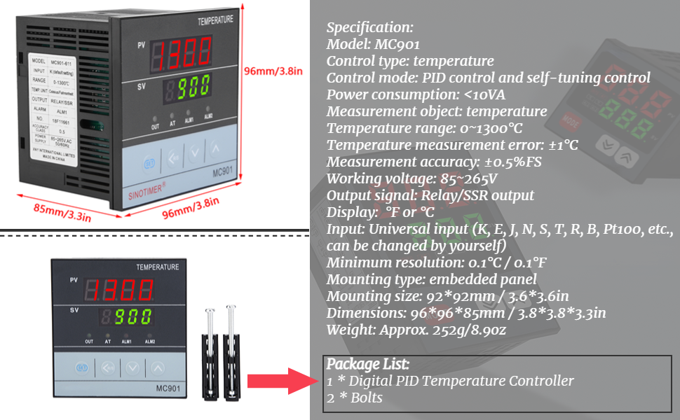 Specification: Model: MC701 Control type : temperature Control mode: PID control and self-tuning control Power consumption: <10VA Measurement object: temperature Temperature range: -199~1300°C Temperature measurement error: ±1°C Measurement accuracy Integrazione relè e SSR, gli utenti possono utilizzare liberamente l'uscita relè o l'uscita SSR. Specifiche tecnicheifiche: Modello: MC701 Tipo di controllo: temperatura Modalità di controllo: controllo PID e controllo autoregolante Consumo energetico: Caratteristiche: 1. Chip integrato ad alta precisione per un'elevata sensibilità e un controllo accurato della temperatura. 2. Supporta la visualizzazione della temperatura ℃ / ℉. 3. Quando viene immesso il segnale della termocoppia, la risoluzione del display digitale può raggiungere 0,1 ℃ /0,1 ℉. 4. Integrazione relè e SSR, gli utenti possono utilizzare liberamente l'uscita relè o l'uscita SSR. 5. Design a guscio corto, 85 mm di profondità, facile da montare e utilizzare. 6. Robusto alloggiamento ignifugo, impermeabile, antipolvere e antiurto. Supporta la visualizzazione della temperatura ℃/℉. MC701 Temperature Controller,Digital PID Temperature Controller K Type Chip integrato ad alta precisione per un'elevata sensibilità e un controllo accurato della temperatura.