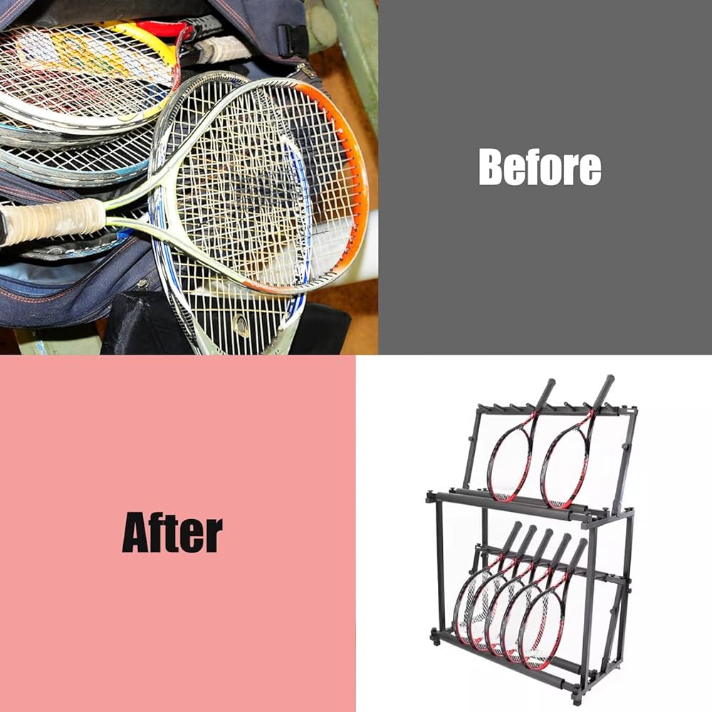 Rastrelliera portaoggetti per racchette da tennis , supporto da parete in metallo per 4 racchette e 6 palline, ideale per badminton , ping pong, organizer salvaspazio per attrezzature sportive che è molto adatto per campi da badminton, campi da tennis, palestre, garage, case, ripostigli 【 Ampia applicazione 】: può contenere racchette da tennis, racchette da badminton, violini, ukulele, chitarre, ecc. Rastrelliera Per Racchette Da Rastrelliera Supporto Verticale Per Racchette Da Racchetta Tennis 【 Protezione antigraffio 】: questo supporto per racchette da tennis è dotato di morbida schiuma EVA per evitare graffi sulla racchetta da tennis. 【 Risparmio di spazio 】: il supporto per racchette misura 44 x 10 x 58 cm (17 3/8 x 4 x 22 7/8 pollici) e può ospitare 30 racchette, risparmiando notevolmente spazio sul pavimento e riducendo l'ingombro sul pavimento, mantenendo le racchette organizzate e di facile accesso